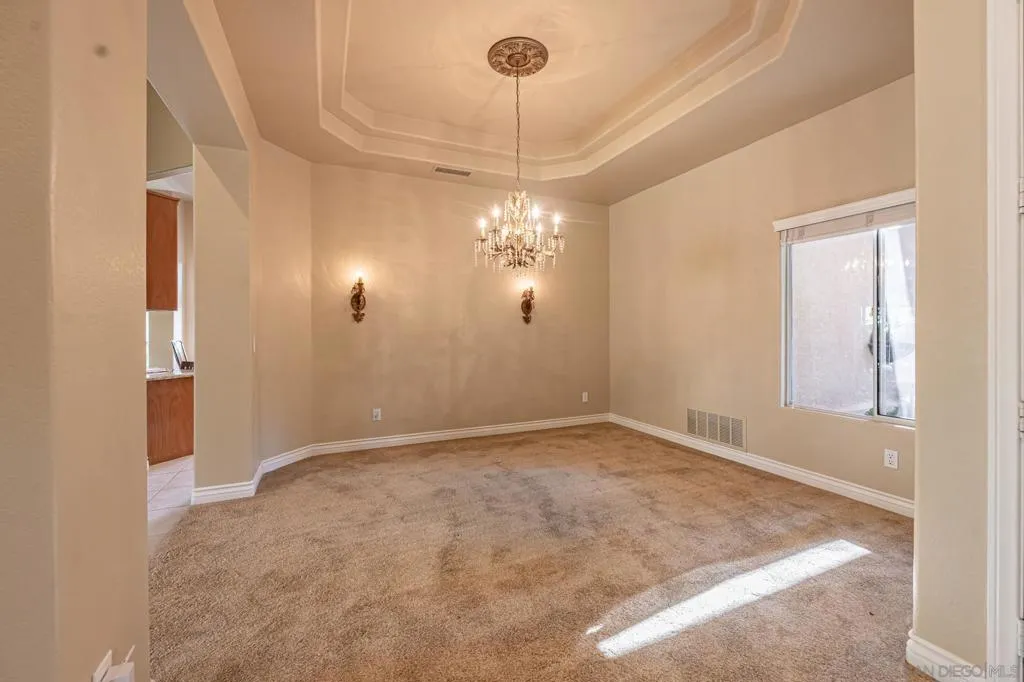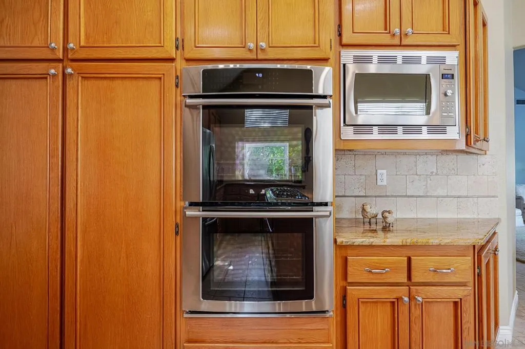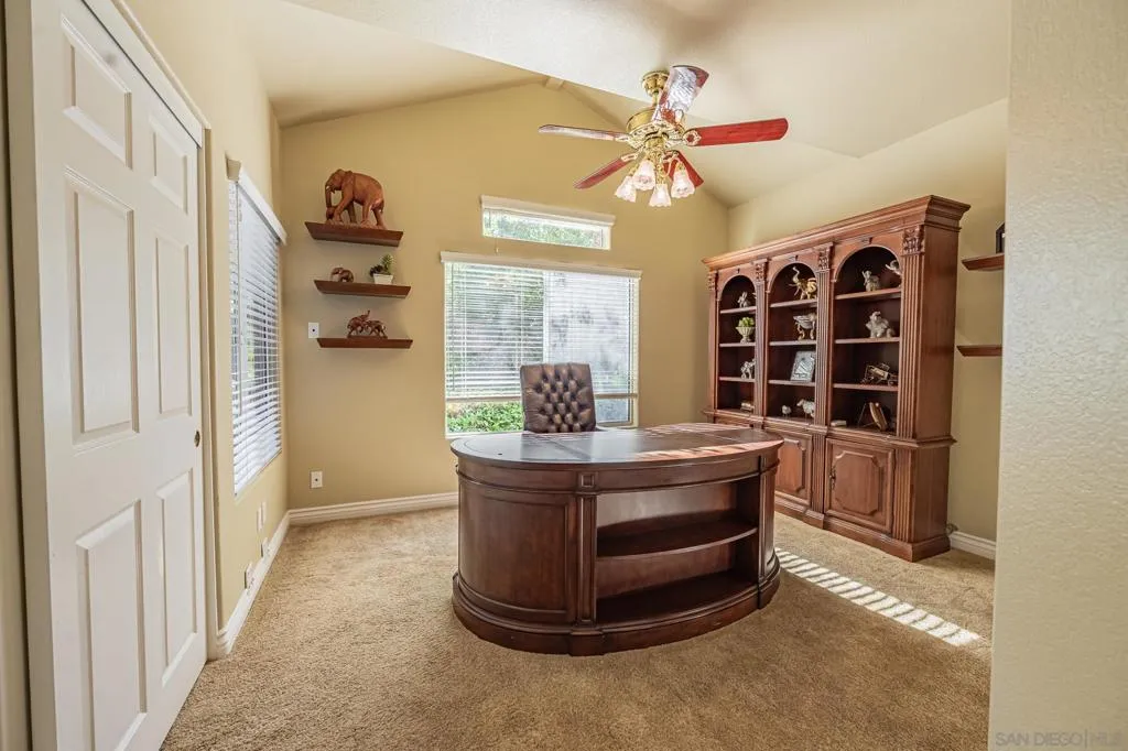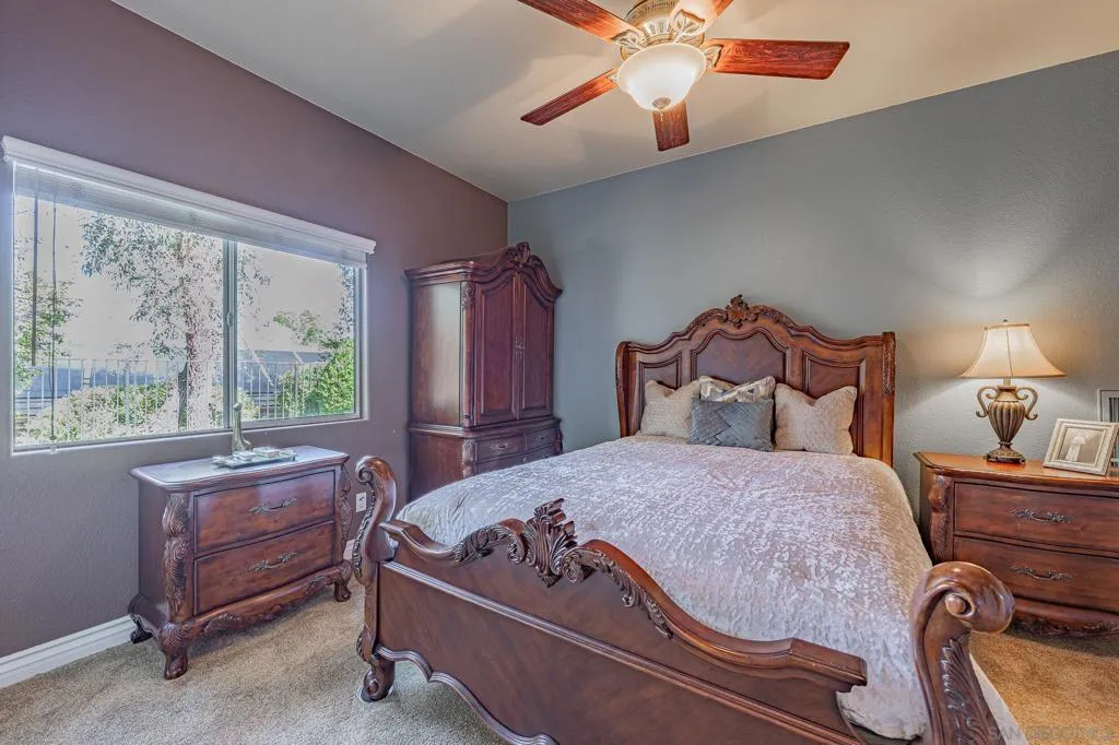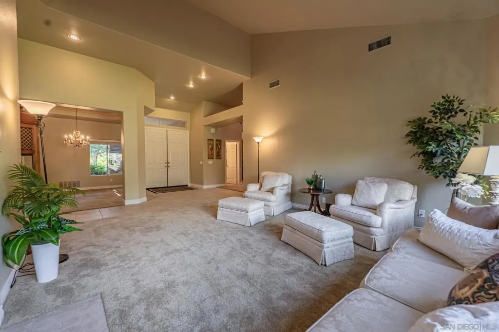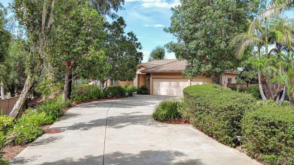 Freshly painted, Single story 4 BR, 3 Bath, 2815 est. sq. ft. w/ 3 Car Garage w/ recently repaired/replaced portion of driveway. Located in a secluded 32 home serene neighborhood on a private cul-de-sac road, next to HOA maintained open space/park (included in the low $190 monthly fees) is move-in ready. The single story open floorplan offers vaulted ceilings, wide hallways, large bedrooms (Primary Bedroom is approx 400 sq.ft.) Kitchen opens to family room- family & living rooms separated by flow through fireplace and pass through wet bar. The peaceful location is shopping & freeway close (I-15 North or South, groceries, restaurants, Auto Parkway, Mershops North County Mall) but still conveniently located far enough away to enjoy the serenity of the neighborhood. Some of the features of this well cared for home are A newer (installed April 2024) AC/ Heater system. SS Kitchen appliances including Electrolux Dual Ovens, granite counter tops- a center island w/ an LG 5 burner gas stove top, pantry+ ample storage in the numerous cabinets as well as a Bosch Dishwasher. Wall mounted Samsung TV in family room w/built in sound system stay as well as the SS LG washer & dryer.