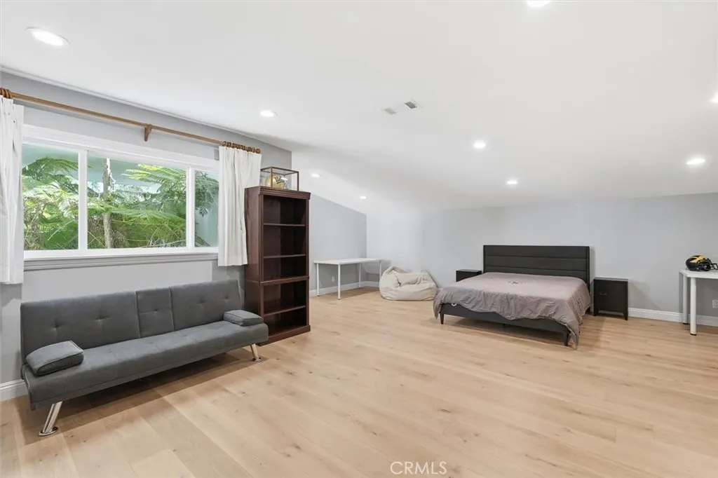 Natural light pours across wide-plank white oak floors, guiding you through an open, connected main level where the living, dining, and kitchen flow effortlessly toward a continuous view deck. Expansive windows frame the hills and shimmering skyline beyond the park, filling the home with a sense of calm and space that only the Palos Verdes hills can offer.