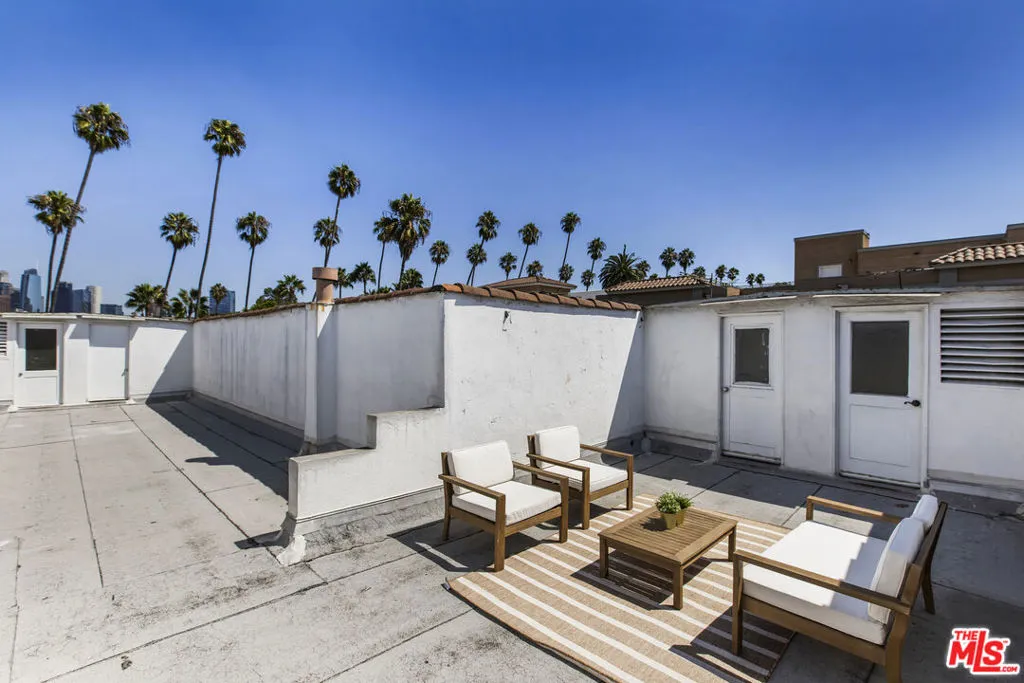 Enchanting 1930s French Normandy Condo – they just don’t build them like this anymore! Tucked behind gates and set far back from the street, you’ll arrive through a lush central courtyard with a front lawn, prolific lemon tree, and gorgeous shared outdoor dining area. Perfectly positioned at the rear of the complex, this oversized top-level one-bedroom feels both private and full of character. The gracious living room features warm bamboo floors, original crown molding, a freshly painted interior, and a large picture window overlooking the verdant courtyard. A separate dining room with built-in sideboard and a timeless pendant light flows seamlessly into the updated kitchen with granite counters, Shaker-style cabinetry, and stainless steel appliances. The sun-drenched spacious bedroom easily accommodates a king-size bed, while the beautifully tiled vintage bathroom remains period-appropriate with a separate tub and shower. Thoughtful updates throughout include fresh paint, new light fixtures, and central heat. Additional highlights include in-unit laundry room with extra storage, basement storage, private 1-car garage, and shared rooftop deck with downtown views. With easy access to DTLA and Koreatown, this condo is a truly timeless gem in the heart of the city.