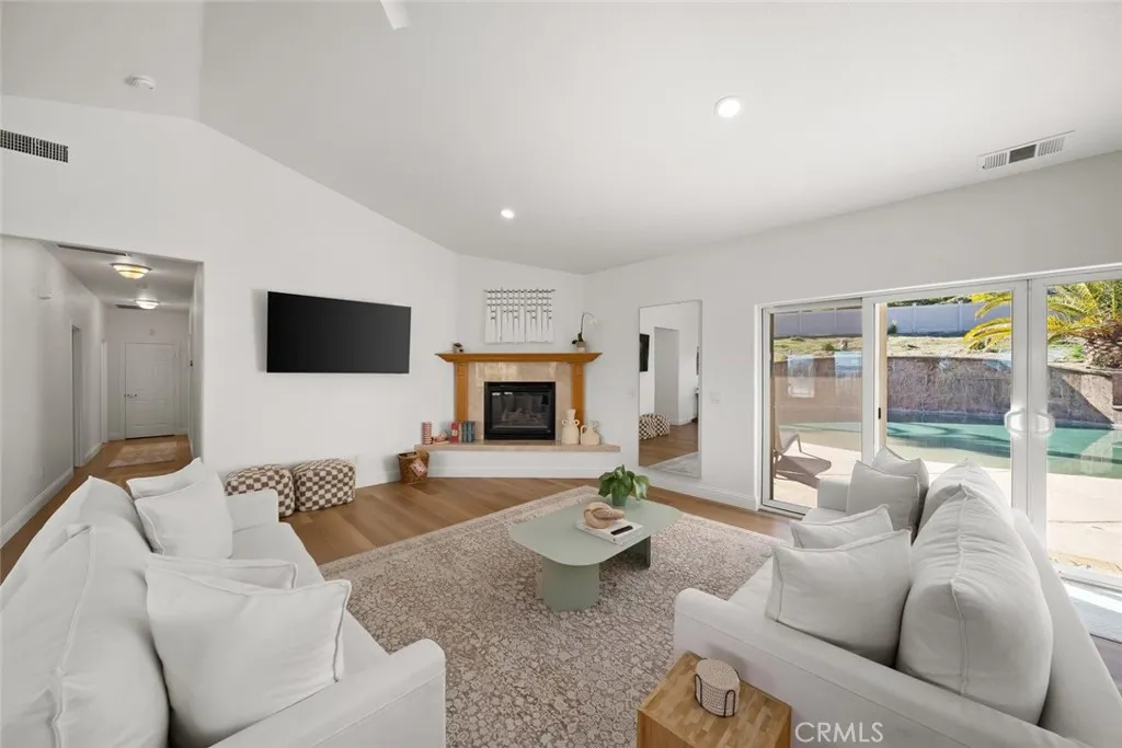 Inside, the open floor plan welcomes you with vaulted ceilings, recessed lighting, and a cozy fireplace that anchors the living area. The kitchen is both functional and inviting, featuring abundant counter space, bar seating, stainless steel appliances including a propane cooktop, dual ovens, range hood, microwave, and refrigerator. A reverse osmosis system, pull-out trash bin, and ample storage ensure the space is as efficient as it is elegant.