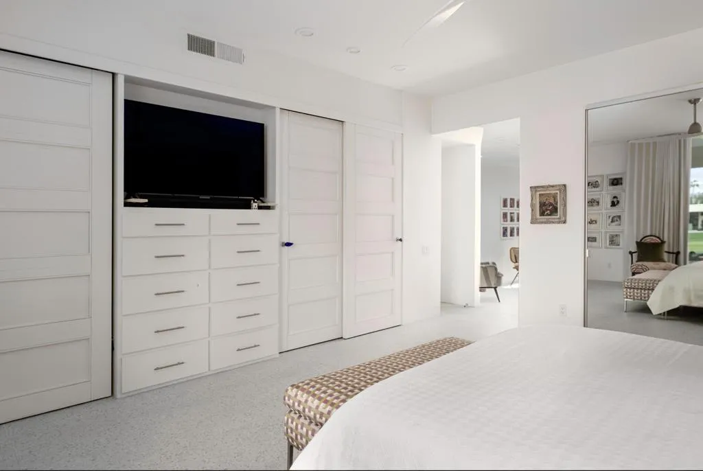 Elegance meets tranquility in this beautifully renovated 2-bedroom, 2-bath + den residence, designed by acclaimed mid-century architect Richard Harrison. Nestled on the 10th green with an ideal north/south orientation, this exceptional home offers both privacy and sweeping golf course views in the prestigious 7 Lakes Country Club. Meticulous upgrades include an updated electrical panel, HVAC system with a bonus mini split in the guest room, a tankless hot water heater and new energy efficient Fleetwood sliders throughout. The interior has been spaciously expanded in the living and dining area, along with the primary bedroom which includes a separate work from home space. A lovely private courtyard provides an idyllic space for relaxing, entertaining, or simply soaking in the serene desert landscape. Redone throughout with top-tier finishes, you’ll appreciate the carefully selected materials and attention to detail. A chef’s kitchen boasts high-end appliances, custom cabinetry, and sleek quartz countertops, making every culinary experience a delight. Both bedrooms offer generous closet space, built-ins, and tranquil views, ensuring comfort and privacy for residents and guests alike. A coveted garage is included for your convenience. Plus, your pool escape and clubhouse are just steps away. Past the 24-hour guarded gate, ‘The Gem of the Desert’ offers a unique elevated lifestyle with its Ted Robinson-designed 18-hole executive golf course, 15 pools and spas and lively William Cody designed clubhouse waiting to welcome you to its formal dining room, casual cocktail lounge and a terrace overlooking the famous Seven Lakes fountain. Welcome home!