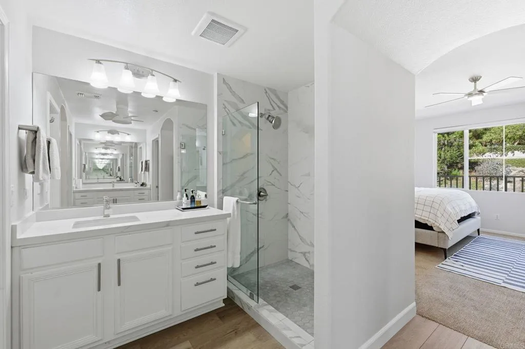 Discover this beautifully upgraded, coveted End-Unit townhome in the heart of Aviara, offering the perfect blend of privacy, comfort, and modern coastal style. Tucked away with no neighbors behind, this 3-bedroom + office, 2.5-bath residence boasts 2,166 sq. ft of open-concept living—the largest floor plan in the Brindisi community. + the 2 car attached garage we all desire! Step inside to bright, airy interiors enhanced by LED recessed lighting, luxury vinyl plank flooring, and plantation shutters. The chef’s kitchen features sleek quartz countertops, stainless steel appliances, and a seamless flow into the dining and living areas—ideal for entertaining or everyday living. Upstairs, the remodeled primary suite feels like a private retreat with a spa-inspired bathroom showcasing a large walk-in shower and custom built-in shelving and drawers. Additional upgrades include granite countertops (from a single slab), MOEN brushed nickel fixtures, KOEHLER sinks, and remote-controlled ceiling fans in the kitchen/dining area and primary bedroom. Enjoy the outdoors in your private, low maintenance backyard—complete with lime and lemon trees that bear fruit year-round. A new fence (2024) and Rheem 50-gallon water heater (2021) add peace of mind. Located in a secure gated community with resort-style amenities including a pool and spa, this home offers easy access to top-rated Carlsbad schools, Aviara Community Park, Shopping and the area’s best beaches—sand just five minutes away. HOA membership includes discounts & benefits at nearby Park Hyatt Aviara! With thoughtful upgrades, a prime end-unit location, and designer touches throughout, this coastal gem truly checks all the boxes.
