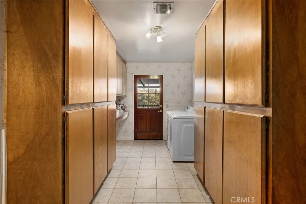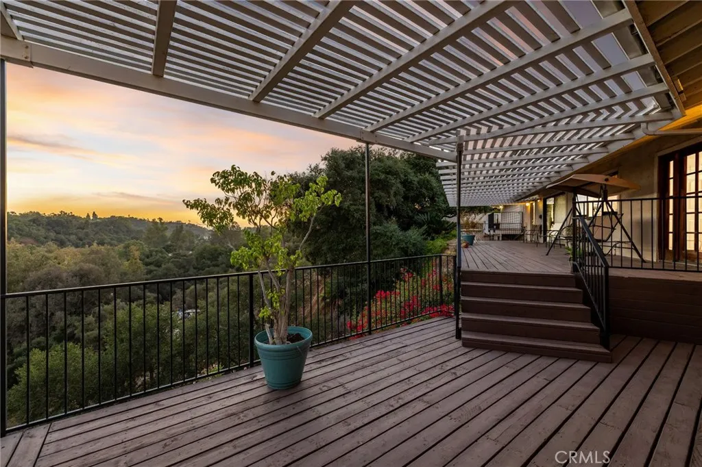 Custom-built home on a prime street with panoramic views and an oversized, horse-zoned lot. Exceptional curb appeal includes a sprawling brick façade, manicured lawn and landscaping, mature trees, and concrete steps to a covered brick porch with a wood-and-glass front door. Inside, hardwood floors lead to a formal dining room and a view-filled living room; the dining room opens through French doors to the back deck and overlooks the living room via an open wrought-iron railing. The living room showcases a full wall of glass framing sweeping vistas, a floor-to-ceiling brick fireplace, and a vaulted ceiling with exposed-beam detail. The spacious kitchen offers solid wood cabinetry, tiled counters and backsplash, stainless steel appliances, a view-facing garden window, and a peninsula with counter seating, while a breakfast nook sits at a bay window overlooking the front yard. A separate family room features a 12-foot sliding door to the deck, more views, a built-in bar, and a vaulted ceiling with an exposed beam. Two convenient half baths serve guests. Down the hall, the primary bedroom includes a ceiling fan, sliding door to the deck and views, a walk-in closet, and an ensuite bath with dual sinks, a tub with tile surround, and a separate glass-enclosed shower. Three additional bedrooms (one with built-ins, currently used as an office) share a full hall bath. An indoor laundry/mudroom with ample cabinetry opens to the backyard and connects to the attached three-car garage. Outside, a deck spans the width of the home to take in unobstructed views of the horse ring below, the canyon, hills, and beyond, while the side yards provide additional space with a rolling lawn and oak trees.