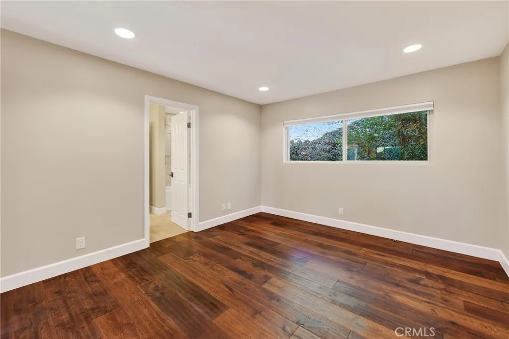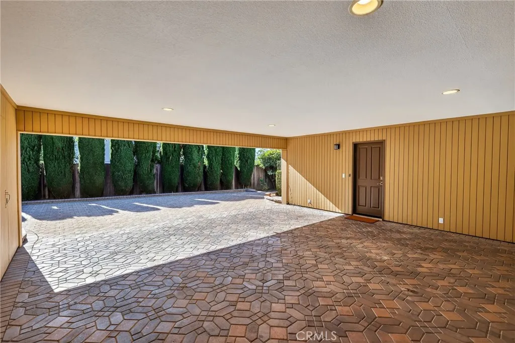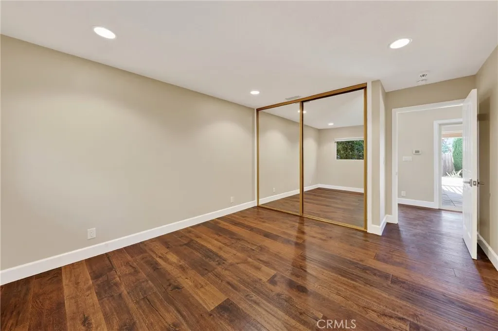 The primary suite has large glass sliding doors leading to a private lattice covered patio, and en suite containing a spacious glass enclosed walk-in tub/shower, displaying views of the private outdoor greenery. The dual-sink vanity and spacious walk in closet complete this tranquil space. The secondary bedrooms feature an oversized layout, warm wood flooring, and mirrored wardrobes, and the 4th bedroom is currently used as an office with no closet.
