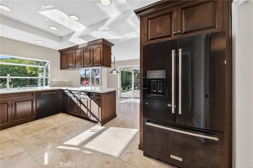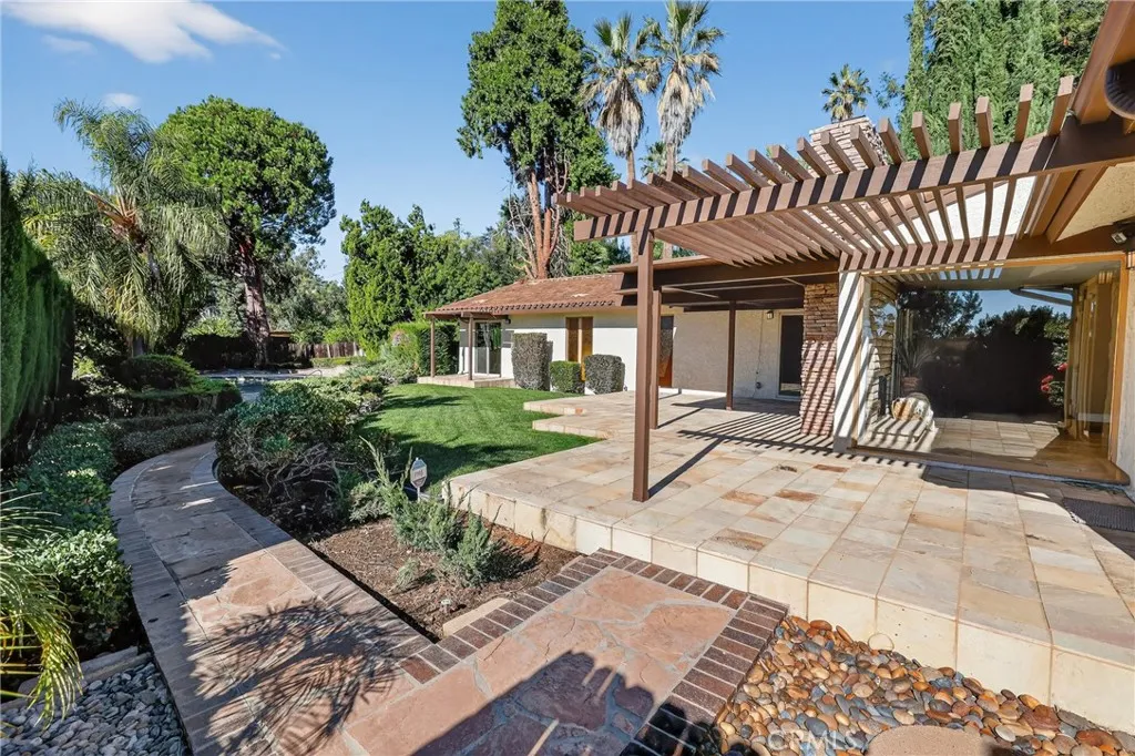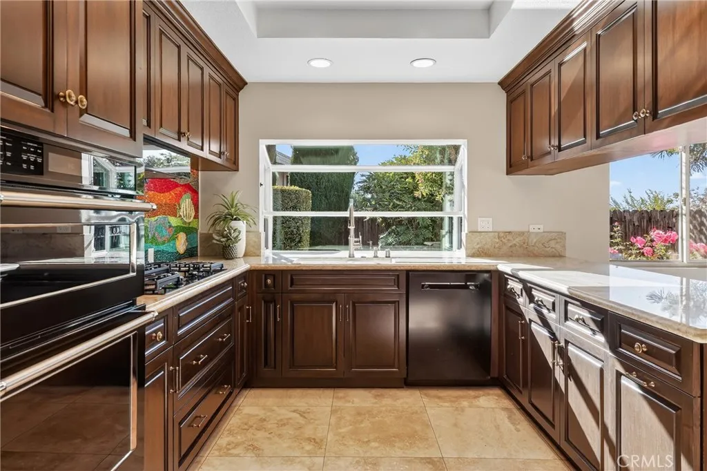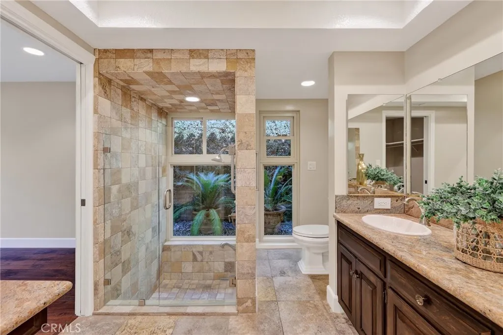 Inside the sprawling layout boasts fresh neutral tones, designed for effortless entertaining and everyday comfort. The formal entry leads to the oversized living room with an elegant slump stone fireplace, and wall of glass overlooking the private courtyard. The family room is a stunning space, where expansive windows embrace natural light and frame views of the picturesque yard. Just a glance away, the kitchen features an abundance of granite counters, and breakfast bar flowing seamlessly into the main living area, perfect for staying connected while hosting. Enjoy beautiful natural travertine flooring throughout, a breakfast nook, and an adjacent formal dining room, designed to accommodate both large parties, or intimate gatherings.
