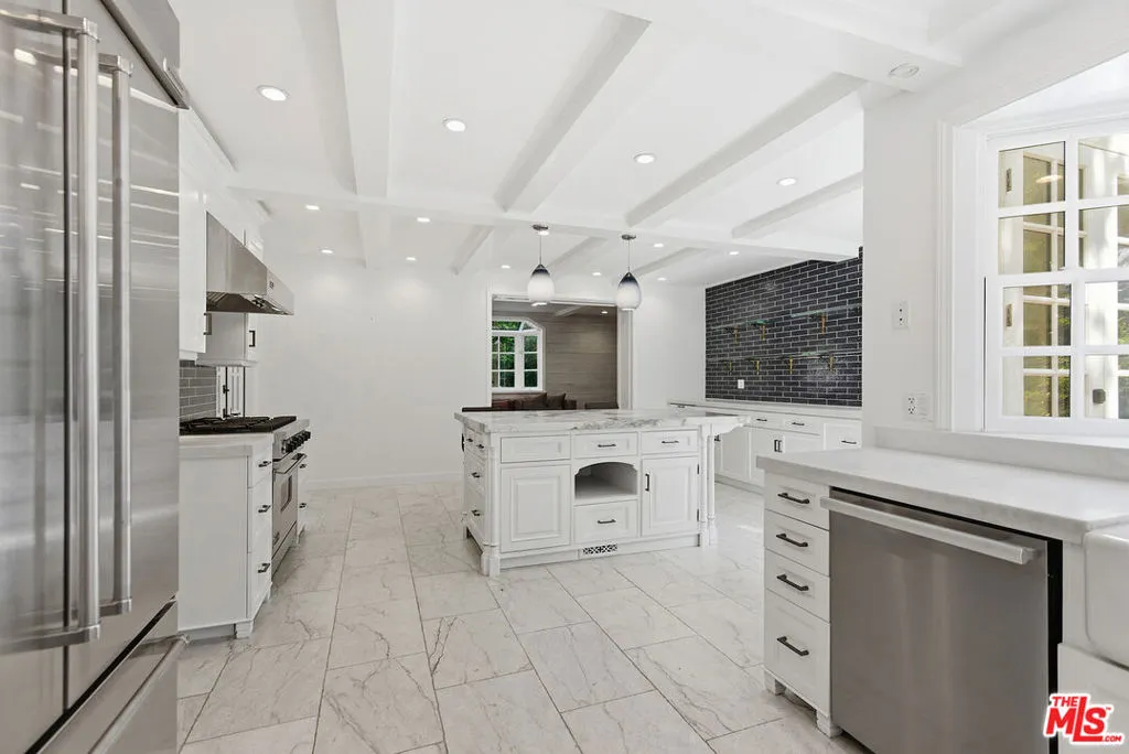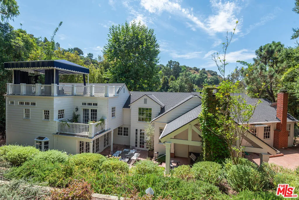 This luxurious Beverly Hills retreat, once owned by Hollywood legends Paul Newman and Joanne Woodward, is a rare and classic find. Situated on 1.2 acres of secluded land, this gated Colonial Revival property on highly sought-after Hazen Drive is surrounded by lush greenery, citrus trees, a bocce court, and a sparkling pool. As you enter through the gates, you are greeted by a grand brick driveway and a charming European garden. A rooftop cabana provides shade for a state-of-the-art gym with breathtaking views of the pool and nearby hiking trail. The estate boasts 4 luxurious ensuite bedrooms that exude both elegance and comfort. The kitchen has been expanded and features a walk-in pantry with dedicated wine storage. A cozy den with oak herringbone floors offers a perfect spot to relax. The living room showcases a striking black marble fireplace adding to the classic design of the home.