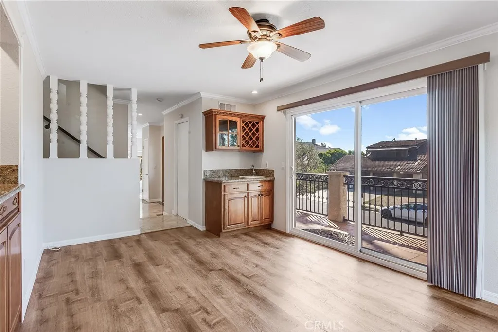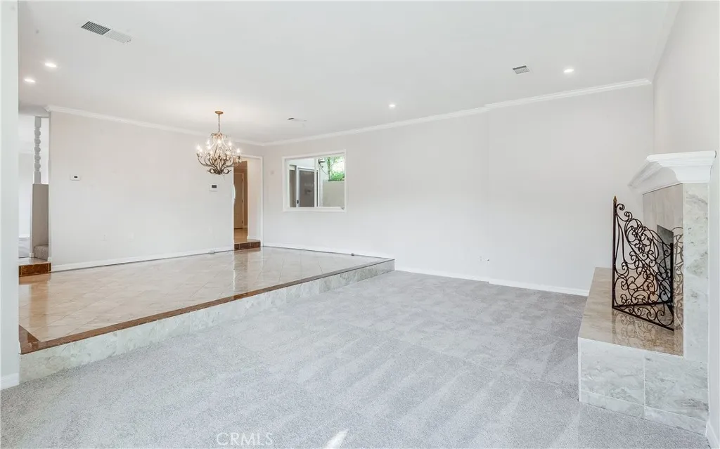 The home boasts soaring 10-foot ceilings, crown moldings, and recessed lighting throughout, creating a bright and airy atmosphere. Recent upgrades include plush new carpeting and stylish laminate flooring. The living room features an inviting gas fireplace and multiple sliding doors that seamlessly connect to indoor and outdoor living spaces, ideal for entertaining and relaxation.