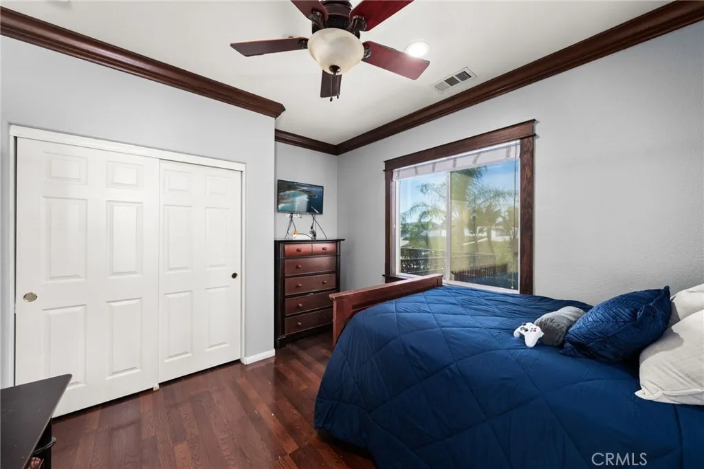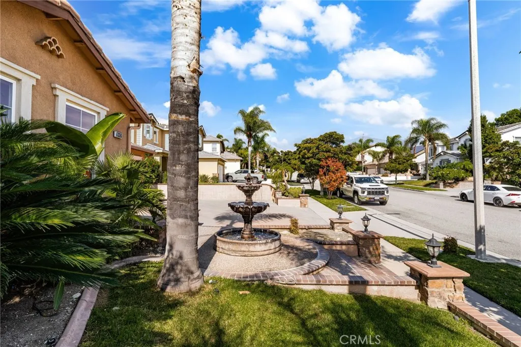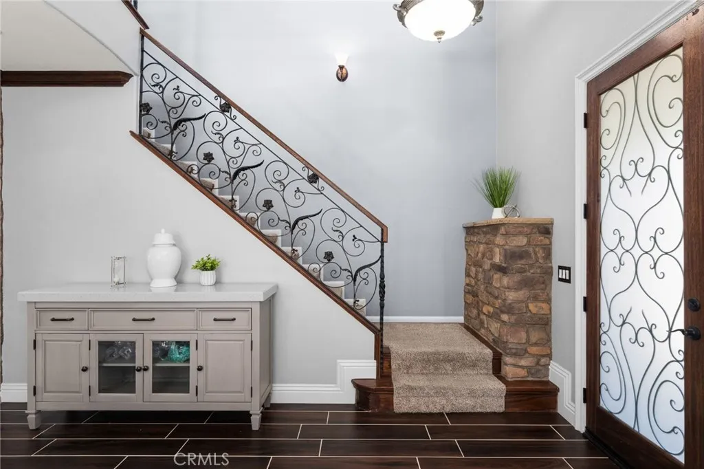 This is the one! Welcome to this stunning home featuring a beautiful open floor plan and exceptional curb appeal complete with a custom water fountain welcoming you at the front entry. As you step inside, you’ll be greeted by an elegant formal living room and dining room with porcelain tile flooring flowing throughout the downstairs. The spacious family room offers a built-in media center, cozy fireplace, and pool views through a custom 9-foot slider accented with designer window coverings. The gourmet remodeled kitchen is a chef’s dream—featuring a breakfast bar island with pendant lighting, quartz countertops, built-in microwave, and ample cabinetry for storage. This versatile layout includes a main-level bedroom and full bathroom, ideal for guests or multi-generational living, as well as a large home office with built-in cabinetry—perfect for remote work. Upstairs, retreat to the luxurious master suite with private access to an oversized deck offering breathtaking mountain and city lights views. The spa-like master bath showcases dual custom stone vanities with raised basins, a separate soaking tub, and a tiled walk-in shower with glass enclosure. The custom walk-in closet has been professionally designed for maximum organization. Additional highlights include crown molding, recessed lighting, custom window coverings, wood flooring upstairs, and a custom carpet runner along the staircase and hallway. The spacious game room features ceiling fans and plush carpet, while the secondary bedrooms are generously sized—one even rivaling a master suite in size. Step outside to your private resort-style backyard! Enjoy the custom saltwater pebble-finish pool with Baja ledge, rock waterfall, and dazzling lava rock fire feature—an entertainer’s dream. The deck and covered patio include a built-in BBQ, lighting, ceiling fan, and outdoor surround sound system. The exterior is equally impressive with stone planters, stamped concrete driveway and lush landscaping. No HOA and conveniently located above the 210 freeway! Don’t miss the chance to make this incredible home yours!