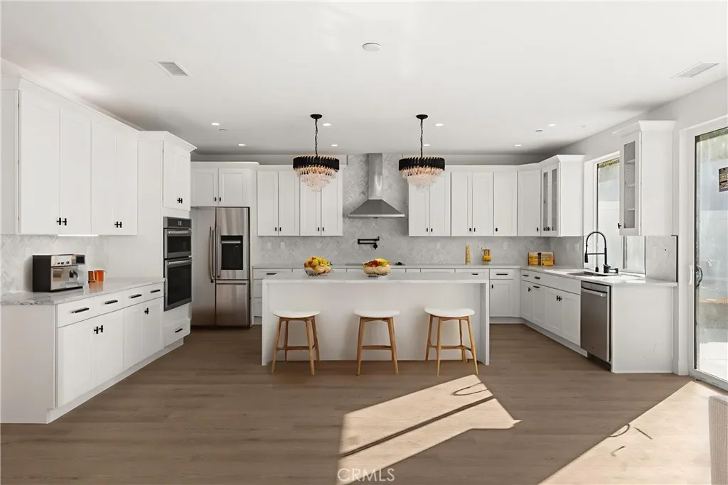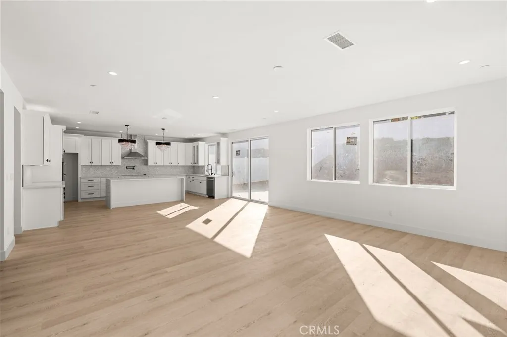 Step inside to a bright and open floor plan featuring high ceilings, clean modern finishes, and luxury vinyl plank flooring throughout. The gourmet kitchen is the centerpiece of the home, showcasing sleek white cabinetry, quartz countertops, stainless steel appliances, and a large center island perfect for entertaining or family gatherings. The kitchen opens seamlessly to the dining and living areas, creating a true open-concept layout filled with natural light.