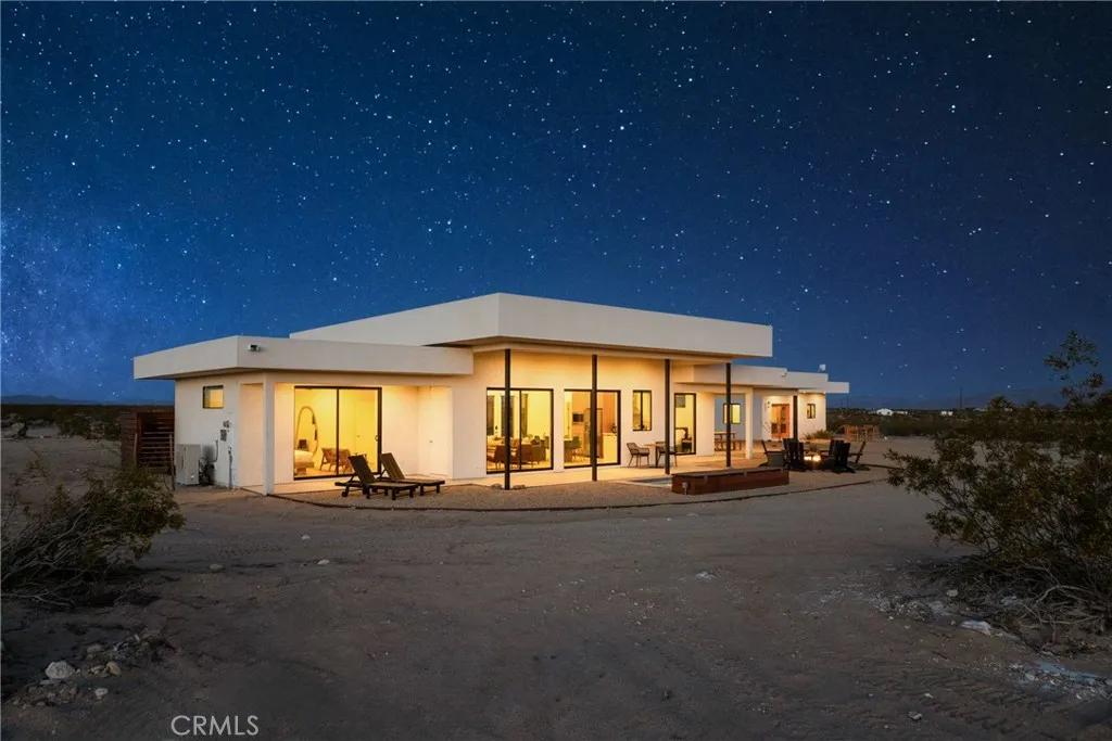 Looking for the perfect Desert Escape? It’s Orion’s Whisper — A 5-star turn-key Airbnb retreat that’s as beautiful as it is profitable. This stunning, modern desert masterpiece spans approximately 1,326 sq ft., with an additional 375 square feet of detached ADU space, all set on 2.5 acres of serene privacy surrounded by sweeping desert views. Perfectly blending luxury living with investment potential, Orion’s Whisper is already a successful operating short-term rental with a Superhost track record and a complete STR package in place — ready for seamless ownership and immediate income! Please note that this property features two spacious primary suites, each with a spa-style bathroom that includes glass-wall showers, modern tiles, brand-new vanities, and modern fixtures. Concrete floors are featured throughout, along with soaring ceilings and a linear zero-clearance fireplace framed by built-in contemporary shelving. The kitchen features new appliances, counters, cupboards, fixtures, and kitchenware, and comes stocked with all the desired kitchen gadgets. The wholly owned solar panels, accompanied by a brand-new solar panel gateway and mini-split A/C systems throughout the property, enhance energy efficiency in every living space. Designed for the indoor-outdoor lifestyle that defines desert living, this home brings the outside in through large, picturesque windows and clean architectural lines. The Detached ADU/guest house features a complete and stocked kitchen, en-suite bathroom, a mini-split AC/heat system, and custom double-glass entry doors. Leading you outdoors, the cocktail Pool that doubles as a hot tub is perfect for stargazing nights or sunny desert days. In addition to the guaranteed views of expansive desert scape, the wrap-around concrete patio tastefully displays Mt. San Gorgonio and Mt. Nebo! Whether you’re looking for a profitable investment, a private weekend escape, or both, Orion’s Whisper delivers on every front. Located steps from 30 acres of open government land — ideal for hiking and exploring outside of the designated Joshua Tree National Park. This property embodies tranquility, creativity, and connection to nature. Turnkey. Stylish. Profitable. It’s worth seeing for yourself. Experience the serenity, the design, and the income potential that make Orion’s Whisper one of the desert’s most sought-after retreats.