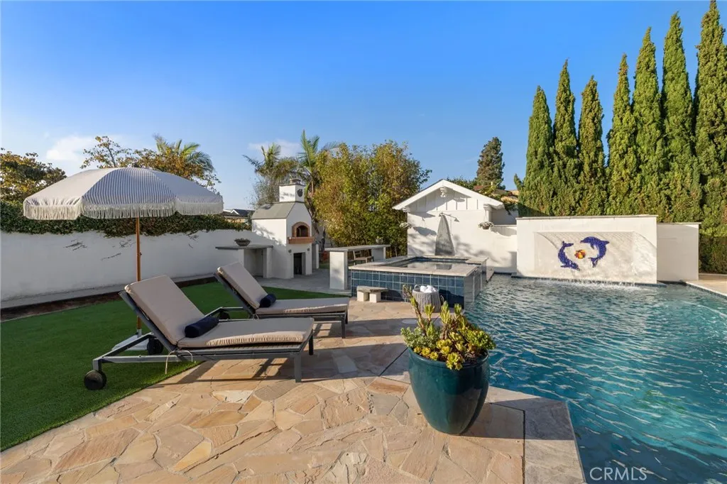 The property’s true highlight is the expansive, sun-drenched backyard—a rare Manhattan Beach feature. Surrounded by mature trees for privacy, this space is a resort-style paradise centered around a stunning heated pool and spa with a fun waterfall feature, outdoor shower, designated bathroom, bocce court, pizza oven, a spacious green area, and a comfortable seating space with a fireplace and TV.
