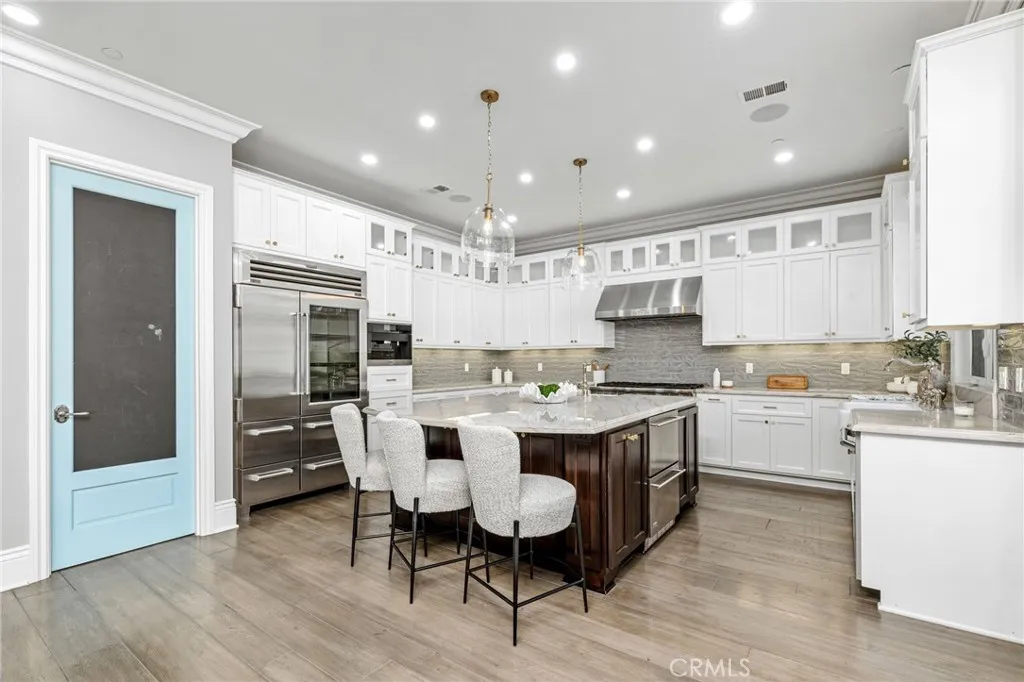The stunning Chef’s kitchen, designed for discerning tastes is appointed with high-end appliances such as a Sub-Zero fridge, a professional-grade six-burner Thermador stove, an integrated Miele espresso maker, a Villeroy & Boch prep sink, complemented by an expansive quartzite island, abundant counterspace, and a generous walk-in pantry.
