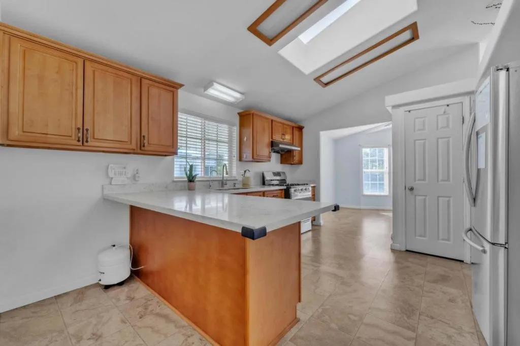 Beautiful Silvercest home has 3 bedrooms and 2 full baths plus a den. Home built in 2000 with 1,568 Sq.Ft. Move-in condition. Large living room features a high ceiling with skylights and a fireplace. Nice kitchen with newer cabinets and granite countertop. Kitchen sink has water filtration system. Stainless steel appliances included. Master bedroom has laminated wood floor, bathroom offers garden tub, stand shower, and extra cabinets. Separate laundry room. Water softener and alarm systems are included. Double-pane windows. Heater system and updated central AC. Home is settled in a quiet area of the park with a long carport that can fit 3 or 4 cars and a storage shed. Guest parking is located next to the home. Convenient location and easy access to freeways and shopping centers. Space rent $1,299. ****** OPEN HOUSE ON THIS SUNDAY 11/9/2025 FROM 12-3 PM ******