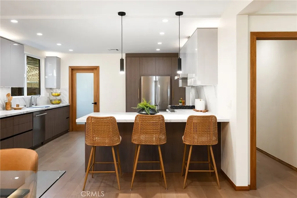 Welcome to this stunning, newly remodeled contemporary residence that beautifully blends timeless Spanish character with modern design and luxury finishes. Step into this fully reimagined 2025 remodel, a gated and private 4-bedroom, 4.5-bath home where every detail reflects high-end craftsmanship and sophisticated style. As you enter the home, you’re immediately greeted by an inviting open-concept floor plan that seamlessly connects the dining area, kitchen, and living room. Natural light floods the space through large windows, highlighting the white oak floors, recessed lighting, skylights, and designer fixtures that bring warmth and modern elegance throughout. The chef’s kitchen is a show-stopping centerpiece, featuring professional-grade appliances, custom cabinetry, and stone-slab countertops designed for dining and entertaining. A dedicated laundry and storage room leads to a versatile basement, perfect for a home office, gym, or creative studio. The adjacent dining area offers an ideal setting for gatherings, while the spacious living room with its statement fireplace provides a cozy focal point for relaxing or entertaining guests.