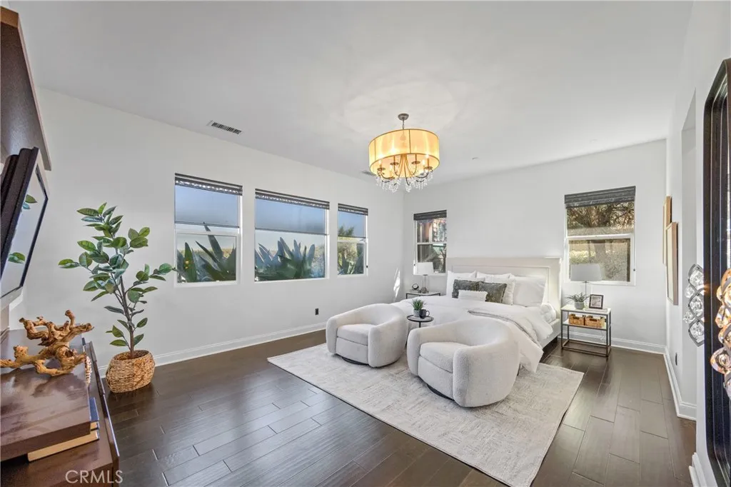Overlooking the Santa Clarita Valley, this exquisite Southern Oaks 5 bedroom, 5 bathroom POOL, SPA and PANORAMIC VIEW executive home with OWNED SOLAR, 4 CAR GARAGE and DOWNSTAIRS PRIMARY SUITE offers privacy, elegance and modern design with sweeping mountain and valley views! One of only 20 homes in this exclusive community, this incredible home sits on a beautifully landscaped, private cul-de-sac FLAG lot with extra long driveway! Sophisticated upgrades both inside and out such as glass tile pool accents with sheer descents, custom pavers, in ground trampoline, built in BBQ and more! Step through the regal entry into a bright, open concept floor plan with soaring ceilings, fresh paint and carpet and! A flex room off the foyer which can serve as a formal dining room, family room or home office with direct access to the gourmet chef’s kitchen! The kitchen is an entertainer’s dream and truly the heart of the home, featuring quartz countertops, large center island with breakfast bar, double oven, stainless steel appliances, abundant cabinetry and butler’s pantry, complemented by an adjacent dining nook with backyard access with poolside views! Stacking sliding glass doors open to the sparkling pool, California Room style covered patio and built in BBQ! The spacious living room is accented by a designer stonework wall and also opens to the resort-style backyard complete with lounge and dining areas, fire pit adorned seating area framed by expansive mountain and valley views! The downstairs layout includes TWO MAIN FLOOR bedrooms. The DOWNSTAIRS PRIMARY SUITE is a luxurious retreat with a spa-like bathroom, soaking tub, walk-in tile shower, separate double sink vanities, and a huge walk-in closet with custom organizers and storage! The second downstairs bedroom offers a full bath and generous closet space, the ideal space for a private office or guest bedroom! Upstairs, the spacious loft overlooks the entry and has stunning mountain and valley views, a perfect media room! 3 additional upstairs bedrooms share 2 bathrooms, including a Jack-and-Jill bathroom, plus a convenient upstairs laundry room with sink and storage! Additional features include a 4 car tandem garage, PAID SOLAR, and NO MELLO ROOS! Situated in a highly desirable Stevenson Ranch neighborhood, this home is nearby top-rated schools, shopping, dining, and outdoor recreation, with quick freeway access! This is a home you will cherish years to come!