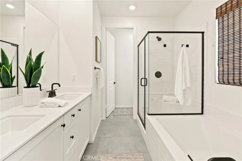 The primary suite has a dual-sink vanity, soaking tub, and upgraded separate shower with matte-black fixtures. Two additional bedrooms share a full bath. An upstairs laundry room with LG washer and dryer provides convenience. Wide-plank luxury vinyl flooring continues into the primary suite.
