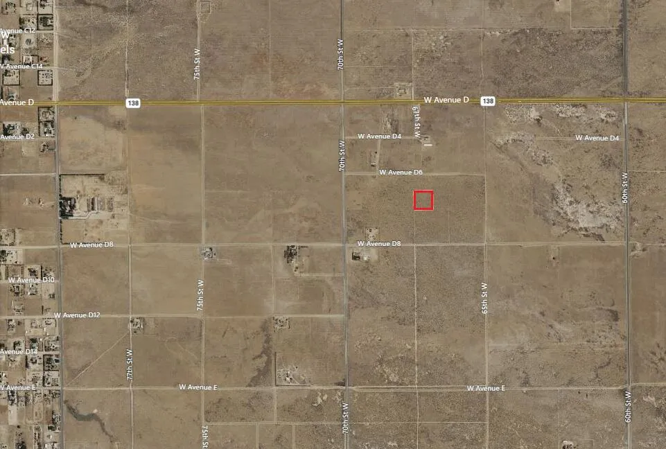 North on Highway 14 to Avenue D. West on Avenue D to 70th Street West. Turn south for 0.3 miles to Avenue D-6, left for 0.3 mile. Property is 450 feet south. Geo-Coordinates (34.77156215, -118.24992302)