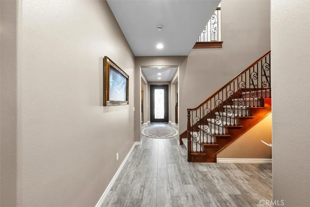 Step through the grand entry into light-filled spaces with soaring ceilings, an elegant wrought-iron staircase, and a gourmet kitchen featuring granite countertops, rich wood cabinetry, stainless steel appliances, and a center island that opens to the spacious family room.