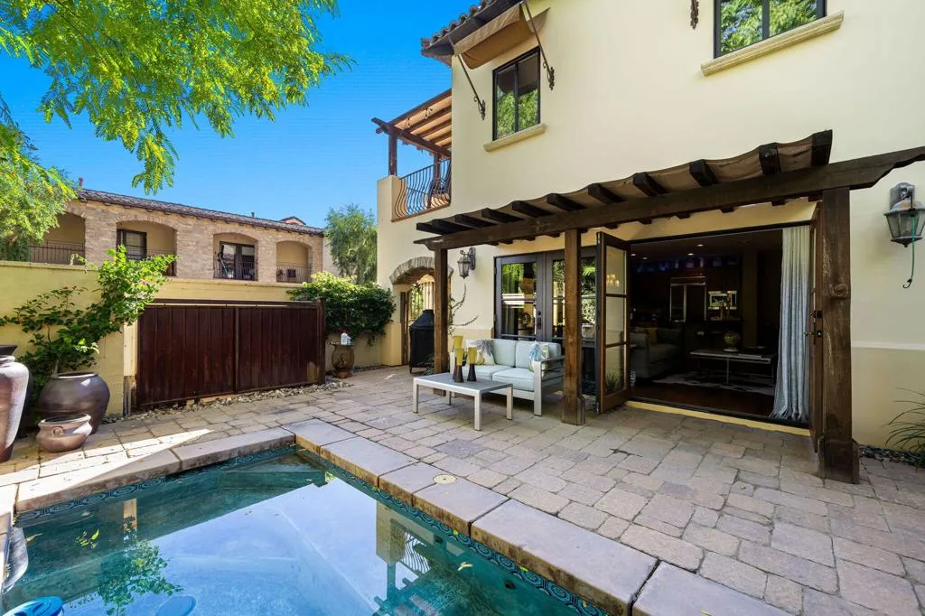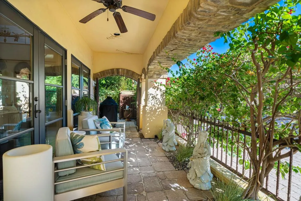 The Villas In Old Palm Springs is a small coveted and gated community of 47 homes embracing the Tuscan architecture of Italy’s countryside. Pavered streets, lush landscaping, and the spectacular, calming presence of the San Jacinto Mountain create a distinctive and inviting ambiance throughout the community. Residents enjoy easy access to hiking on scenic local trails. The location also allows for a leisurely walk to the heart of the vibrant Downtown Palm Springs where acclaimed restaurants, unique shopping experiences, Village Fest, and lively social establishments await. This free-standing townhome features a spacious great room with vaulted ceiling, hardwood floors, beautiful fireplace and open to the gourmet kitchen and dining area. The kitchen is equipped with high-end stainless appliances, slab granite countertops, and fine wood cabinetry. French doors lead to a large, wrap-around private courtyard – perfect for relaxing evenings in the private jetted spa or entertaining guests in a serene and refined atmosphere. The first-floor guest bedroom features an en-suite bath and a patio area, providing privacy for guests. Upstairs, the primary suite has two walk-in closets, two balconies and a spacious bathroom with dual vanities, a large soaking tub and separate shower. Another guest bedroom on the upper level includes its own en-suite bath. Enjoy meeting friends and neighbors for a social BBQ, a game of bocce ball, or relaxing around the two heated swimming pools and three spas.