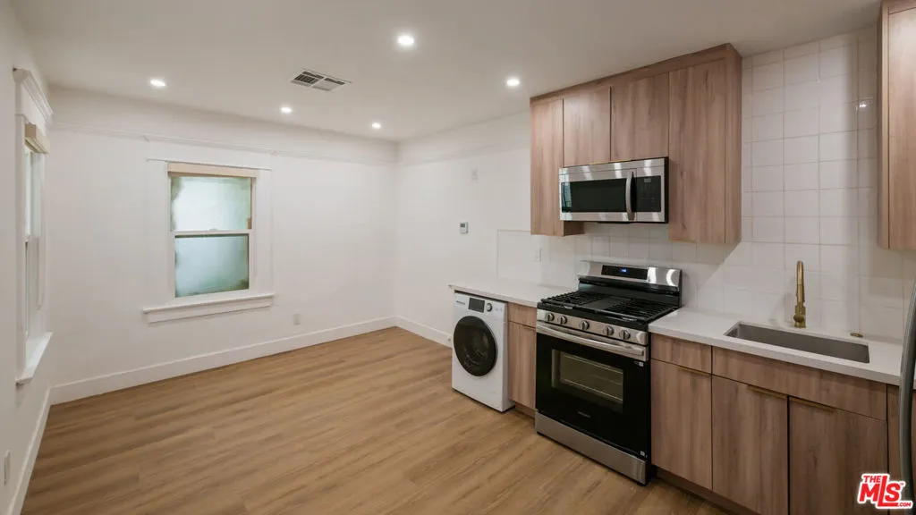 Step into elevated Hollywood living with this fully renovated studio at 5729 Carlton Way a chic, move-in-ready retreat that perfectly blends modern design with everyday comfort. Thoughtfully updated from top to bottom, this residence showcases high-quality craftsmanship, designer finishes, and a bright, open layout ideal for city living. The light-filled interior welcomes you with oversized windows, warm wood-style flooring, and sleek recessed lighting that create an inviting ambiance. The contemporary kitchen is both stylish and functional, featuring quartz countertops, stainless steel appliances (including gas range, microwave, and refrigerator), custom cabinetry, and designer tile backsplash. A built-in washer/dryer combo adds convenience without sacrificing space. The flexible layout offers room for both rest and productivity, with a cozy living/sleeping area and an intimate dining nook that easily doubles as a home office. The bathroom feels like a private spa, complete with a floating vanity accented by gold hardware, a framed mirror, and a glass-enclosed shower surrounded by refined tile work. Set on a peaceful street just moments from Hollywood & Highland, the Walk of Fame, Trader Joe’s, Equinox, and Runyon Canyon, this location offers the perfect balance of tranquility and access. Blending designer style with functional sophistication, Unit 1/4 at 5729 Carlton Way offers a rare opportunity to experience Hollywood living at its best.