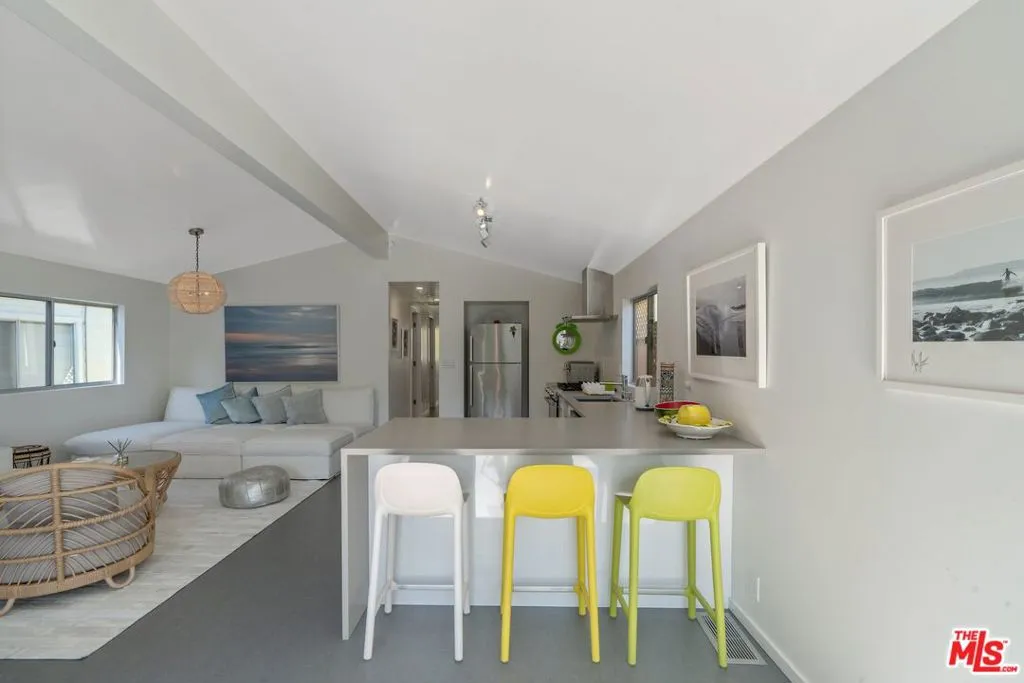 Immaculately redone 3-bedroom/2-bathroom in fantastic cul-de-sac location in Paradise Cove’s chic lower bowl. Enter through a sweet deck through sliding doors to find a beautifully laid-out open floor plan with high ceilings and spacious living and dining areas. The kitchen with peninsula counter features a sleek design and newer appliances. The bathrooms are showstoppers, with the hall bath wrapped in ocean-hued tiles evoking the beach just steps away. The en-suite primary bathroom is a minimalist dream, featuring an oversized shower with rainfall feature. The bright and airy bonus third room is a true indoor/outdoor space with built-in bunk-beds, skylights and sliders that open directly onto a beautiful garden. Perfect for hosting friends and family, or for using as a studio, office, or workout space — plenty of room to make it your own!The property also has tons of storage space for surfboards, close-by parking for visitors, and LOW space rent. Residents of Paradise Cove enjoy exceptional amenities, including gated security for peace of mind, tennis/basketball courts, a playground for the kids, a clubhouse overlooking the sea, world-class hiking, biking, and surfing, and of course direct access to one of the most iconic beaches on the coast.