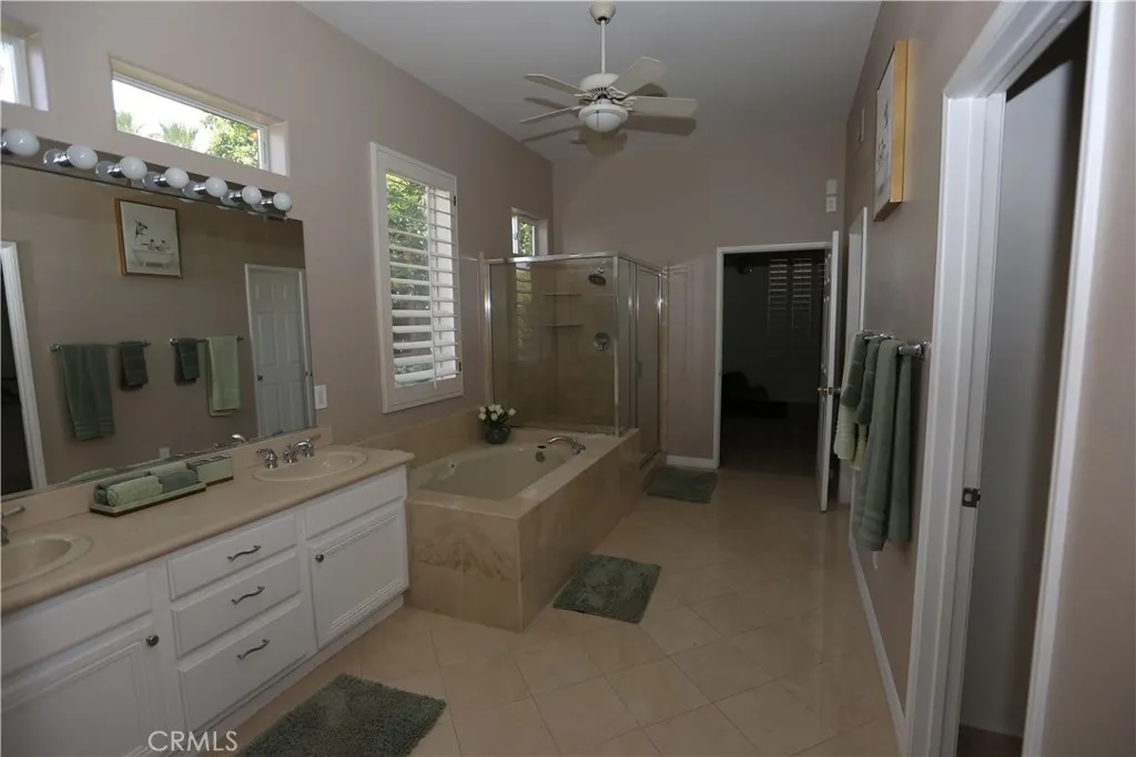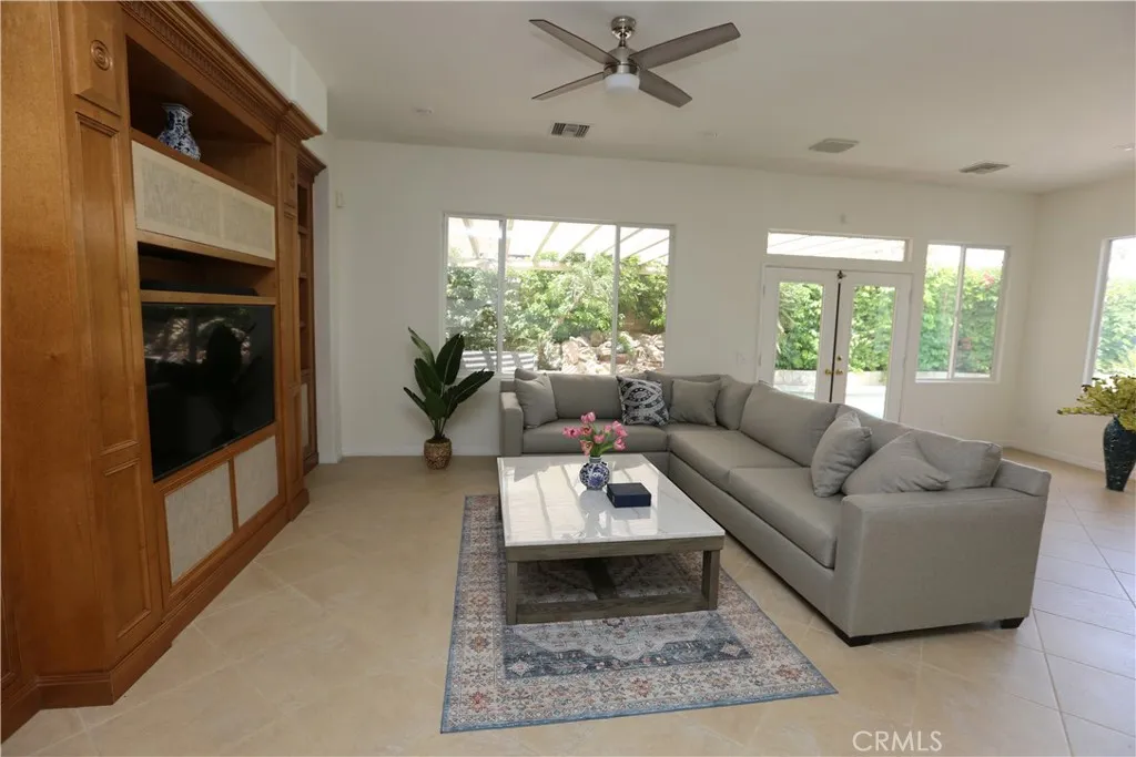 Enjoy year-round relaxation in your tropical backyard oasis with a PebbleTec pool, spa, and rock waterfall, framed by mature palms, fruit trees, and a covered patio with misting system and mounted TV. Upgrades include owned solar panels, newer HVAC and ductwork, epoxy-finished garage with workshop and golf-cart space, and full interior/exterior audio and security systems.