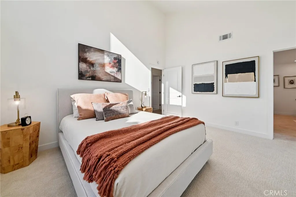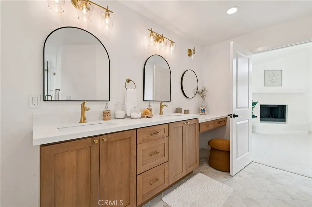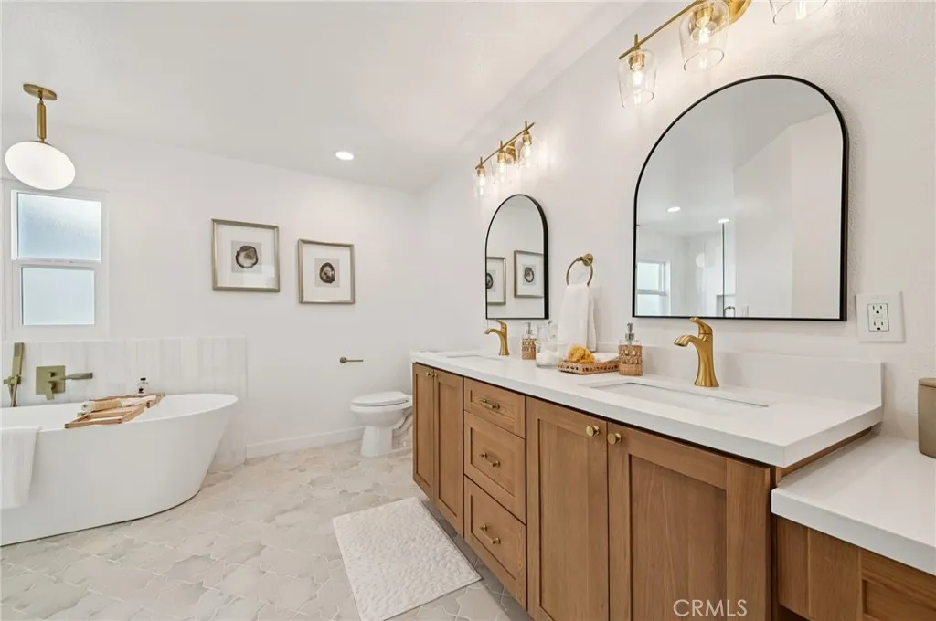 Upstairs, the expansive primary suite feels like a private retreat with vaulted ceilings, an oversized walk-in California closet and a spa-inspired bathroom showcasing dual vanities plus an extra makeup vanity, a free-standing soaking tub, luxurious marble tiles, and modern fixtures that exude calm sophistication. Two additional spacious bedrooms and a stylish guest bath offer flexibility for family, guests, or a home office.