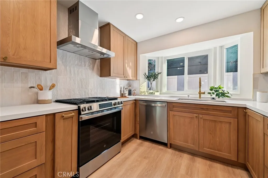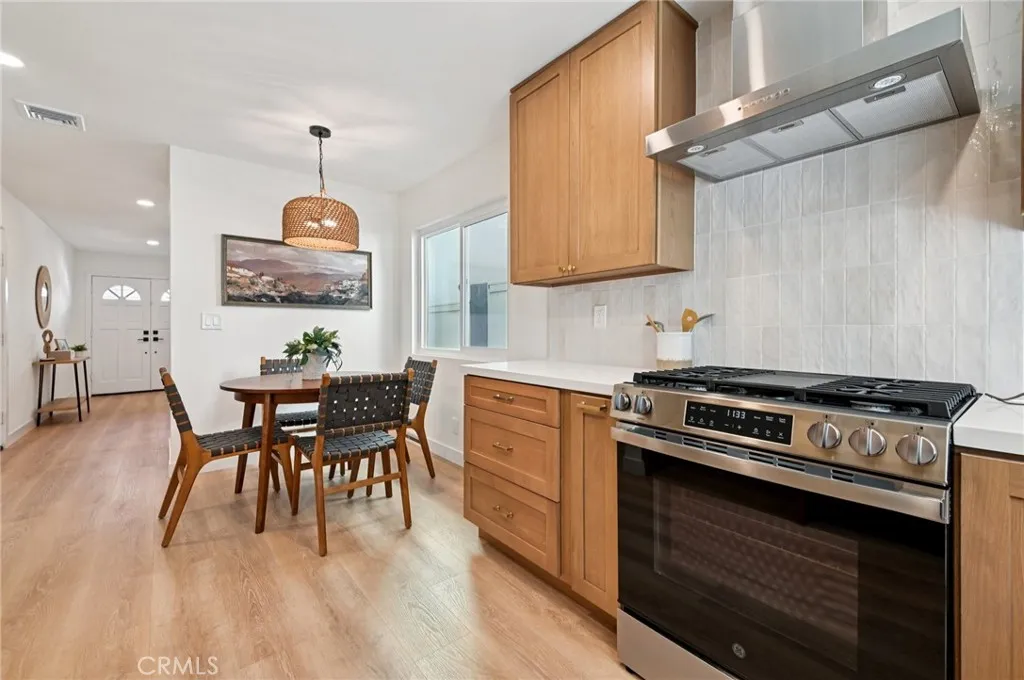 Wide-plank luxury vinyl flooring and soft neutral tones flow throughout, leading you into an airy living space with recessed lighting, and a cozy fireplace that invites conversation and relaxation. Dual sliders lead you out to your very own private backyard oasis. The heart of the home—the stunning chef’s kitchen—features rich warm-tone soft-close shaker cabinetry, gleaming white quartz countertops, elegant champagne hardware, and high-end GE stainless-steel appliances.