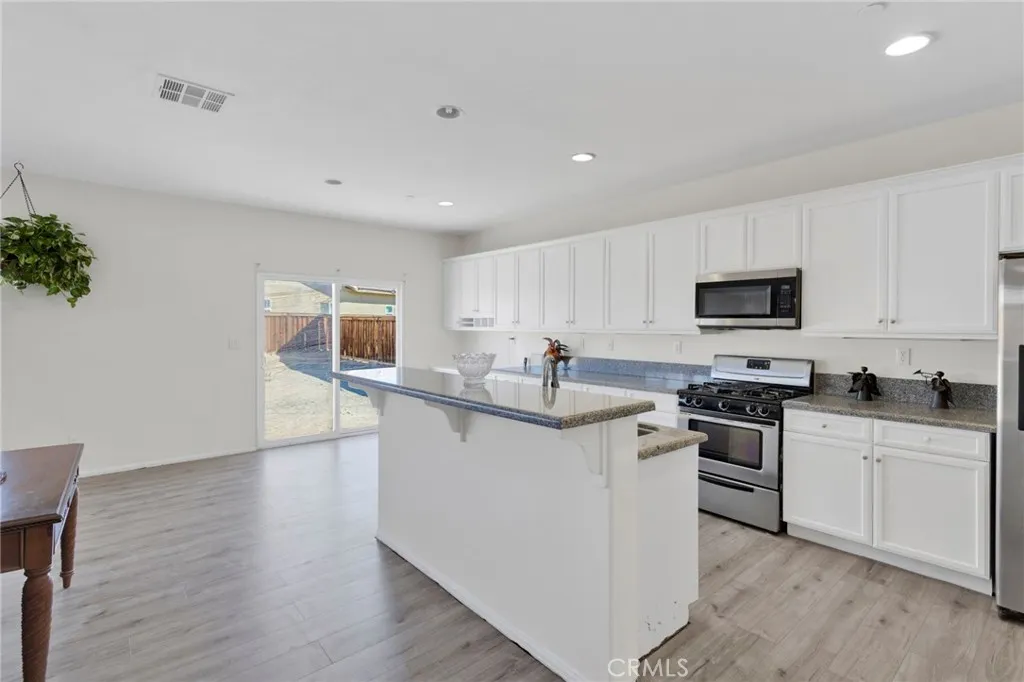 Welcome to this beautiful Adelanto home offering comfort, style, and convenience in a prime location close to shopping, dining, and local amenities. As you arrive, you’ll appreciate the easy-care desertscape front yard, providing a clean and modern curb appeal that perfectly complements the surrounding desert charm. Step inside and be greeted by an open and inviting floor plan with new flooring throughout, recessed lighting, and high ceilings (9 feet+) that create a spacious and airy atmosphere. The living and dining areas flow seamlessly together, making it ideal for both relaxing evenings and entertaining guests. The kitchen features granite countertops, ample cabinet space, and a layout that’s perfect for everyday cooking or hosting family gatherings. Each of the three bedrooms offers generous space and natural light, while the three bathrooms provide both function and comfort for the whole household. The backyard offers a clean slate, ready for you to design your dream outdoor retreat — whether that’s a garden, patio, or play area.