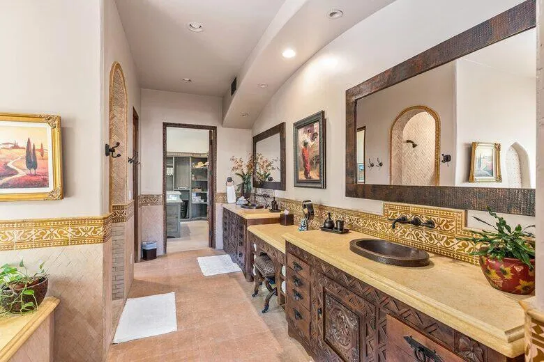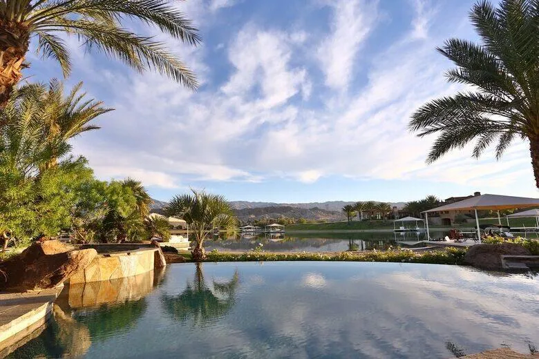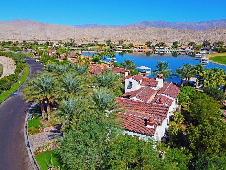 Experience lakeside luxury in this stunning custom Spanish Hacienda, nestled on a quiet swim cove with a private beach, covered boat dock, and Ski Nautique! This gated estate offers a 3BD/4BA main home plus a 1-2BD guest casita. Enjoy hand-carved mesquite doors, vintage timber-beamed ceilings, and authentic Spanish tile throughout. Entertain with two outdoor kitchens, an infinity-edge pool and spa with swim-up bar, fire pit, and tiled fountains under 30+ majestic date palms. The guest casita boasts over 2,000 sqft with breathtaking lake and mountain views, a master suite with coffee bar, fireplace, and full amenities. only 22 minutes from Palm Springs, 5 minutes to the FAMOUS Coachella Concert, and a mere 12 minutes to the Thermal Private Airport. Come and experience what everyone is talking about–visit this exceptional property, embrace the lifestyle it offers, and envision the lakefront living you’ve always dreamed of. Your oasis awaits, just a short drive from the excitement of Palm Springs and the renowned Coachella Concert. exceptional retreat for those seeking beauty, privacy, and resort-style living!