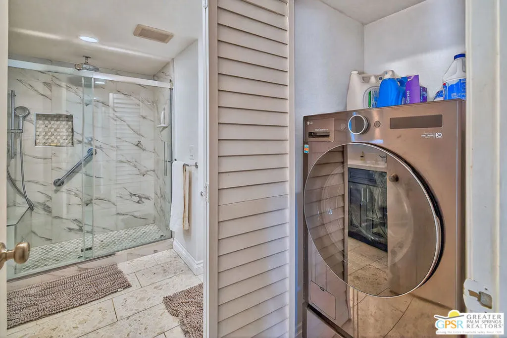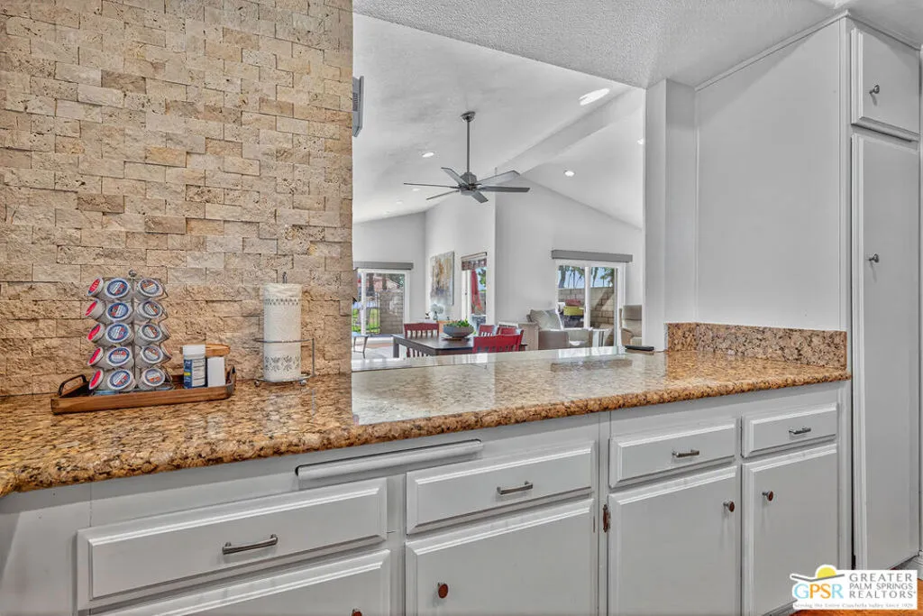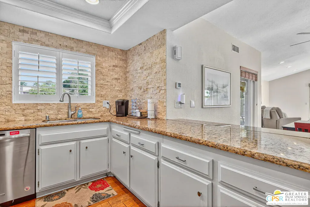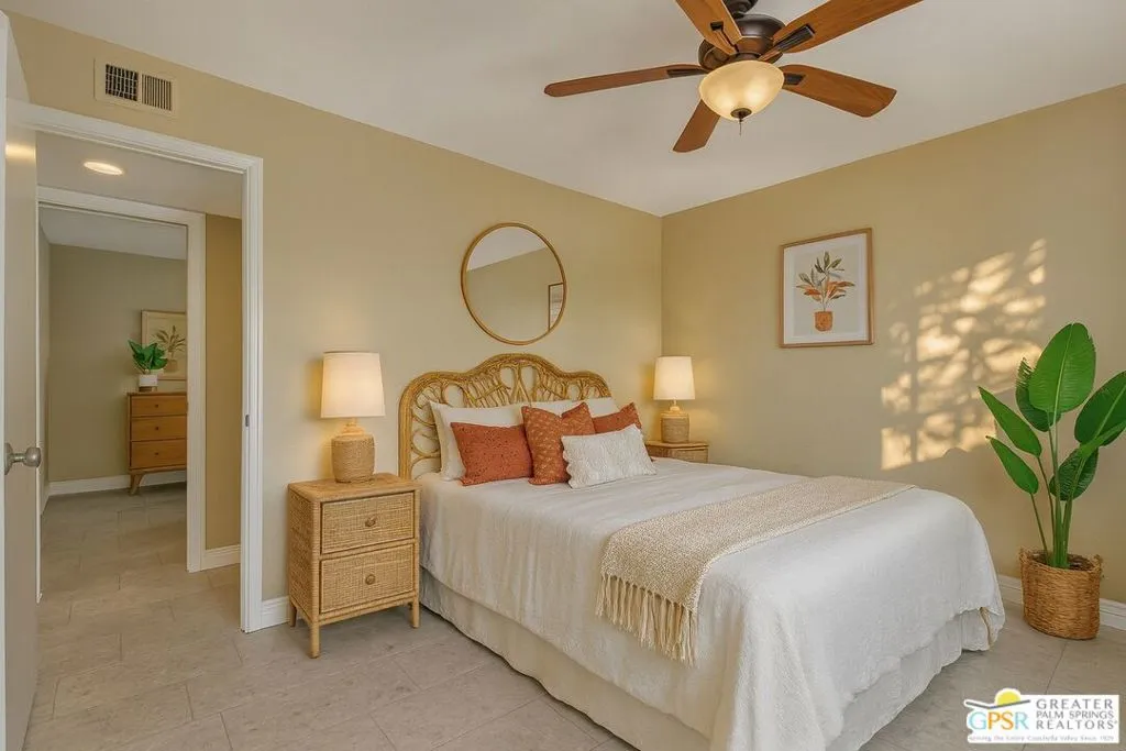 Rare corner-unit privacy at Indian Palms Country Club neighbors on ONE side only, with green space views from your spacious back patio. This beautifully updated 2-bed, 2-bath condo offers 1,494 sq ft of move-in-ready living with a flexible den (perfect 3rd bedroom/office), fresh kitchen, updated bathrooms, new flooring in primary bedroom, dual-pane windows, and NEW AC system for energy efficiency and year-round comfort. Prime location with community center across the street, pool/spa steps away, and 2 covered carport spaces included. Indian Palms offers true resort-style living with 27-hole championship golf course, full-service restaurant/bar, multiple pools/spas, tennis/pickleball courts, fitness center, 24-hour guarded gate security, and beautifully maintained grounds. Perfect for snowbirds, first-time buyers, retirees, investors (short-term rentals approved!), or second-home seekers. Minutes from Empire Polo Grounds (Coachella/Stagecoach), championship golf, Indian Wells Tennis Garden, shopping, dining, medical facilities, and I-10 access. Exceptional HOA value covers security, landscaping, pool/spa maintenance, clubhouse/fitness access, building exterior/insurance, water, and trash. Discover your perfect desert retreat at 48910 Eisenhower Drive! One or more photo(s) has been virtually staged.