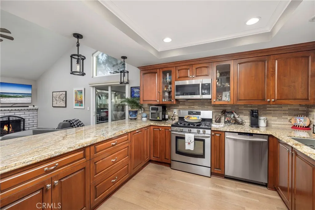 Welcome home to this beautifully updated 2-bedroom, 2-bath retreat that perfectly blends modern comfort, functionality, and coastal elegance. Step through the double-door entry into a bright, open living space featuring high ceilings, new wood flooring, and expansive glass sliders framing stunning 180° mountain and city lights views. Enjoy cozy evenings by the gas fireplace—or unwind in your private hot tub while soaking in the tranquility of this hidden oasis in the heart of Huntington Beach. The outdoor living space has been thoughtfully redesigned with elegant hardscape and newer cedar fencing, offering exceptional privacy as the home backs to a lush greenbelt filled with birds and flowers—an uncommon feature for the area.