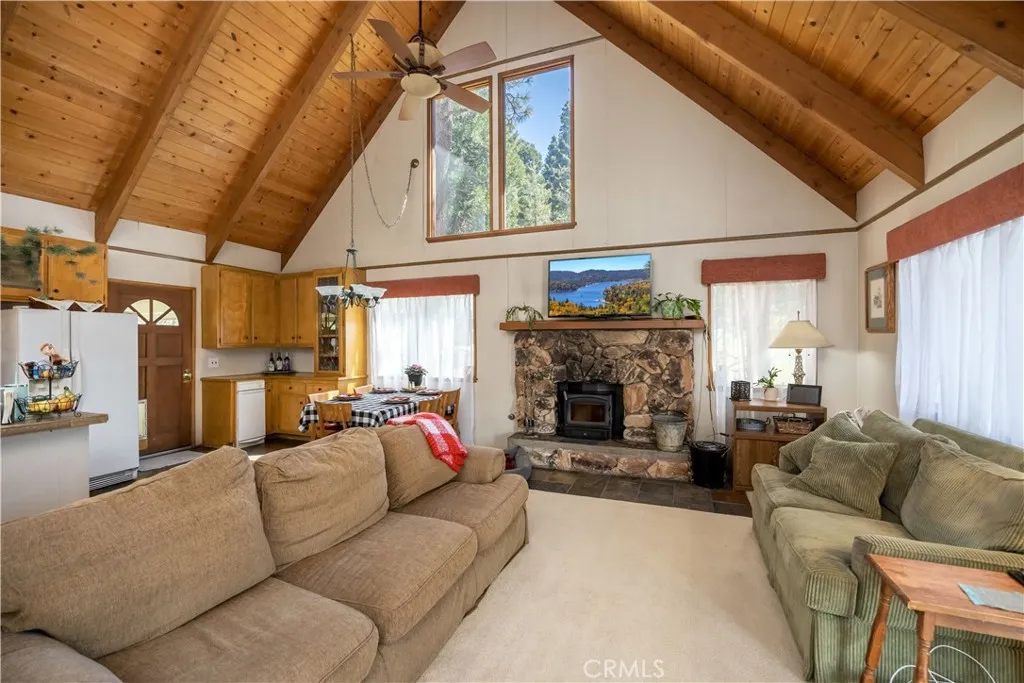 Welcome to 26937 Tunnel Drive, a modern mountain getaway in the heart of Lake Arrowhead, CA. This charming 4-bedroom, 3.75-bath home offers 3,060 square feet of living space on a generous 12,090 square foot lot. Designed for comfort and convenience, the home boasts dual living spaces, at one time designed as two separate units, making it ideal for flexible living arrangements. Step inside to discover an open floor plan highlighted by high ceilings and cozy fireplaces in both the family and living rooms. The kitchen is well-appointed with essential appliances, and the in-unit laundry offers added convenience. With ample space for gatherings, the home includes a wet bar and spacious dining areas. Enjoy the serene outdoor setting with a private balcony extending from the master bedroom. The large lower patio hosts a built-in BBQ and gas fire pit, perfect for entertaining. A huge fenced yard provides plenty of room for kids and pets to roam. The attached two-car garage and expansive dual driveways provide parking for multiple cars, plus room for a boat or RV. This property comes with lake rights, enhancing your recreational options. Located near Grass Valley Lake and park, and within easy reach of the golf course, it’s perfect for those seeking both relaxation and adventure. Don’t miss out on this wonderful opportunity to own a piece of Lake Arrowhead paradise!