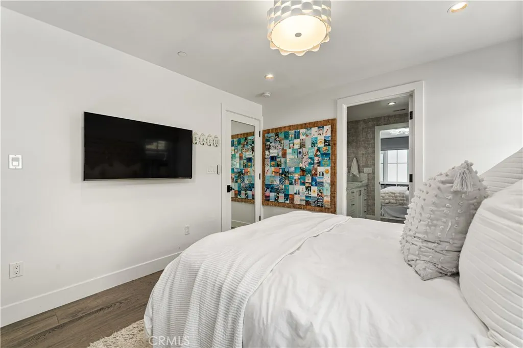 Upstairs, all four bedrooms are thoughtfully placed to maximize comfort and functionality. Two guest rooms share a stylish Jack and Jill bathroom, while the third guest room features its own en-suite bath with a tub and shower combo. A built-in desk in the hallway utilizes every inch of space efficiently, and a full laundry room with a sink and ample cabinetry adds convenience. The primary suite is a luxurious retreat. It includes a custom walk-in closet complete with shoe storage, jewelry drawers, and ample room for clothing and accessories. The bedroom opens to a private patio furnished with a seating area and fire pit, creating the perfect spot to unwind. The spacious master bathroom features dual sinks and an oversized walk-in shower.