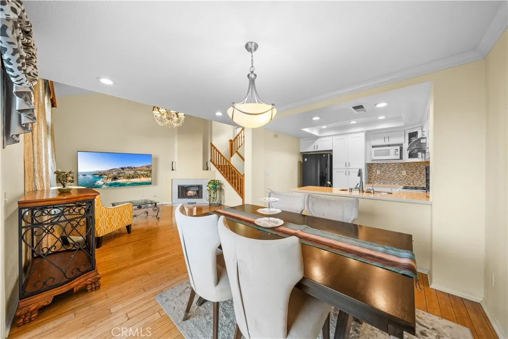 Welcome to this beautifully renovated two-story unit townhome in the desirable West Covina community. This carefully maintained 2-bedroom, 2.5-bathroom primary residence showcases premium upgrades, including wood flooring throughout, custom-made top-quality curtains, a large crystal chandelier, and whole house water softener. The open floor plan with soaring high ceilings creates a bright, inviting space, featuring a cozy fireplace in the spacious living room that flows into the dining area and a fully upgraded gourmet kitchen with water filter.