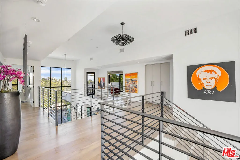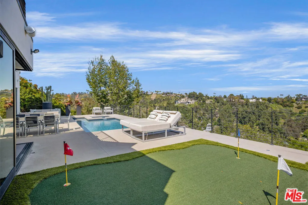 This contemporary estate is brand new and located in Bel Air, offering breathtaking panoramic views from almost every room. As you step into the foyer, which features double-height ceilings and expansive windows, you will fall in love with the property. The open floor plan is ideal for indoor outdoor living, and the luxurious living area boasts a bar and sliding glass doors that open up to the deck. The chef’s kitchen includes stainless steel appliances, a breakfast bar island, and an accordion window that opens to an outdoor bar. Enjoy summer evenings with friends and family in the dining room, featuring a two-story window and chandelier. The upper level features a living space with a balcony and en-suite bedrooms, accessible by a railed walkway. The master bedroom offers stunning views over Bel Air, a walk-in closet with built-ins and a center island, a tub, a dual sink vanity, and a glass shower. Relax in the garden surrounded by breathtaking views, seating areas, a dining space, and a pool with a spa. This state-of-the-art smart home is designed to cater to all lifestyles with just a touch of a button.