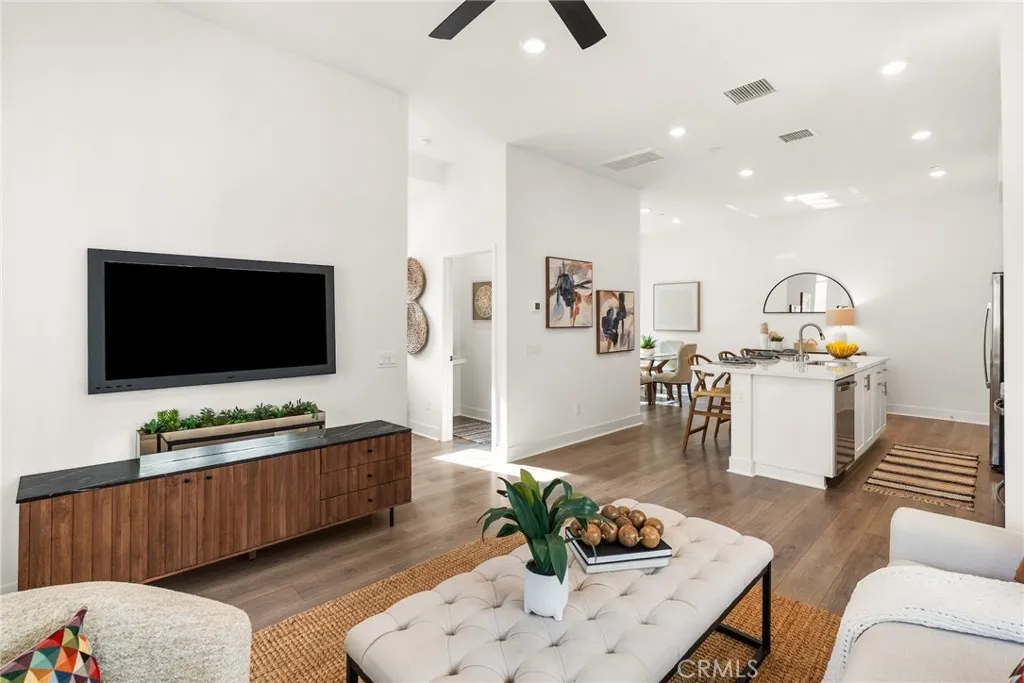 The home’s tri-level floorplan creates distinct spaces for daily routines. Stylish RevWood plank flooring flows throughout, complemented by tile flooring in the primary and guest baths. The first floor features a flexible bonus room, ideal as a home office, guest quarters, or workout space. On the second level, the heart of the home naturally blends living, dining, and cooking spaces. The kitchen features Symphony Canvas cabinetry, quartz countertops, designer backsplash, and GE stainless appliances. A spacious island is perfect for everyday cooking or casual entertaining. This level also includes a laundry area with GE washer and dryer.