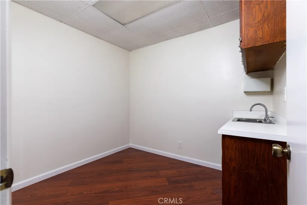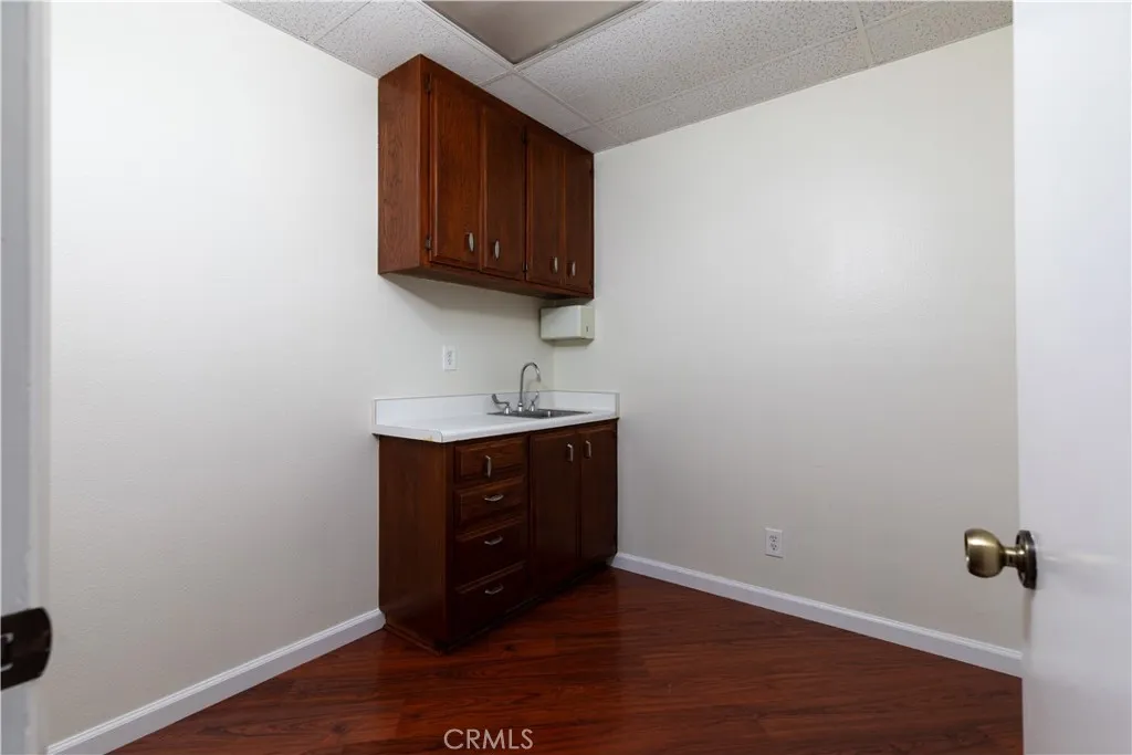 This suite features six private rooms built out for medical use, each with a hand-wash sink, plus a reception/front desk area, laminate flooring, and central A/C and heating. Ample parking available for staff and clients.