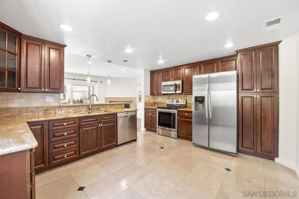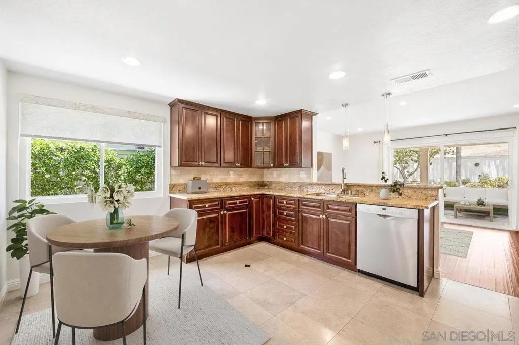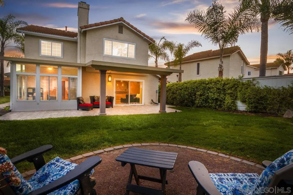 Move-in-ready home situated on a peaceful street with no neighbors on one side and open space behind the property offering privacy and scenic views. ENTIRE interior painted. Inviting exterior with thoughtfully crafted paver pathways guiding you to the front entrance and continuing to the backyard. Smart, keyless front door welcomes you inside. Open-concept kitchen seamlessly connects to the family room with gas fireplace creating a warm and comfortable space. Separate formal living and dining rooms and a light-filled sunroom provides a flexible space perfect for a home gym, playroom, or creative retreat. Interior features include granite countertops, tile flooring in the kitchen and bathrooms, wood flooring on the first floor, energy-efficient double-pane windows and sliding doors, and central air conditioning. Attached 2 car garage features epoxy flooring, built-in storage, and an app-enabled garage door opener. Professionally landscaped backyard oasis comes with drought-tolerant plantings, UC Verde grass, and jasmine-lined fencing. Covered patio with recessed lighting and multiple lounge areas creates an ideal space for the outdoor entertainer. Nature lovers will appreciate direct access to hiking and biking trails at Black Mountain Open Space Reserve, and nearby pond behind the neighborhood. Community amenities include pool, spa, clubhouse, tennis, basketball courts and playground. Located within the highly desirable Poway Unified School District with no Mello Roos, this home offers the perfect balance of comfort, functionality, and lifestyle. Some photos are virtually staged.