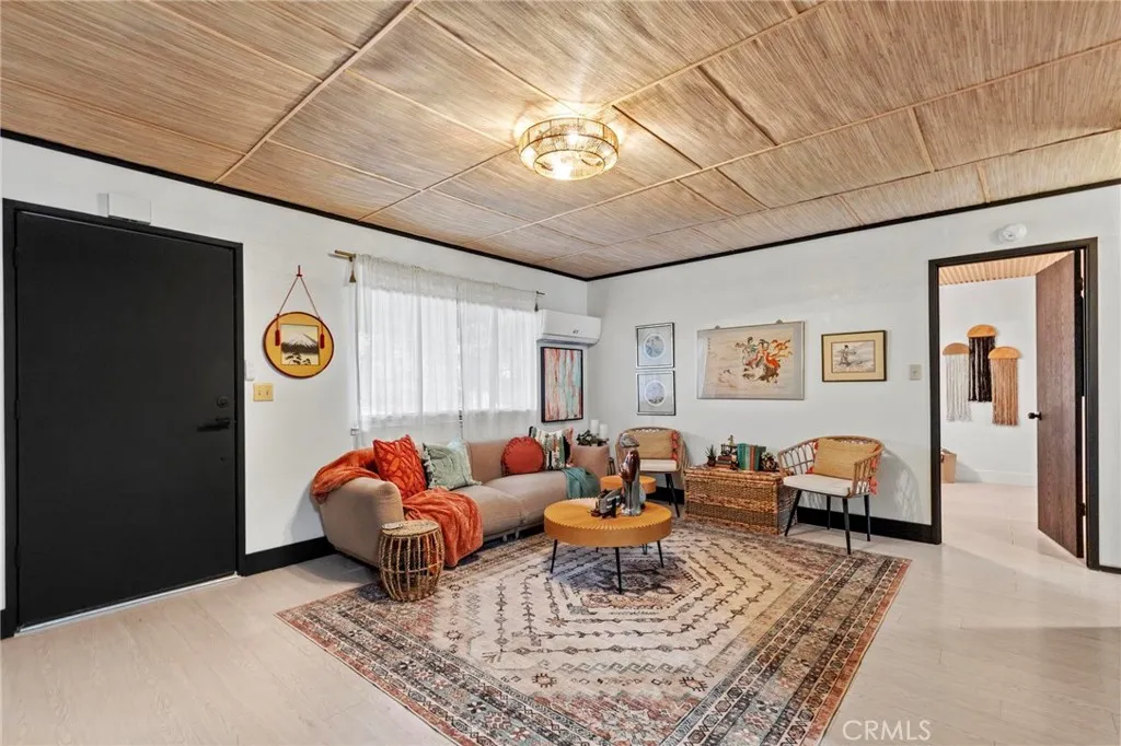The master bedroom features a beautiful bamboo accent wall and ceiling treatments that add dimension and warmth, complemented by custom lighting. The secondary bedroom is light-filled and inviting, while modern low-profile fans throughout the home ensure style and comfort in every space.