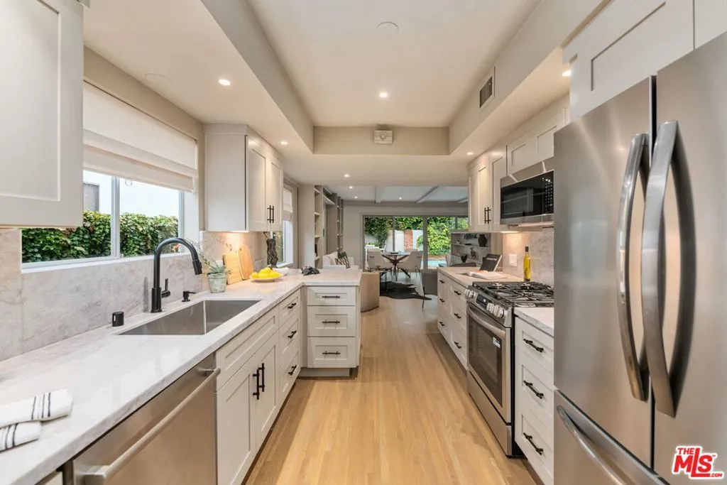 Casual sophistication is the result of a successful blend of traditional and contemporary styles. This delightful and welcoming poolside home celebrates both. A traditional entry hall affords access to all bedrooms and to living and entertaining areas — which in contemporary fashion flow from the all-new kitchen through the dining/family area overlooking the patio and pool to the fireside living room. Milgard glass panels bring the patio and pool in — in true SoCal indoor/outdoor living style (which extends to the primary bedroom as well). There are 3 bedrooms in all (one functions equally well as a den or office). Notable here is the ideal, sensible and efficient floorplan: every room is where it should be, and the result is a feel of greater space than its nearly 1600 sq.ft. The finished garage offers the flexibility to be a gym, kids’ playroom, studio or adapt to an ADU. The hand of a noted designer is evident in the selection of color palette, lighting, wood flooring, stone, textures, appliances, hardware, cabinetry and other finishes. Updated electrical, plumbing, lighting, etc. Convenient location should you wish to venture out of this warm, charming, private and sophisticated nest. Enjoy the photos, but come and enjoy a visit even more.