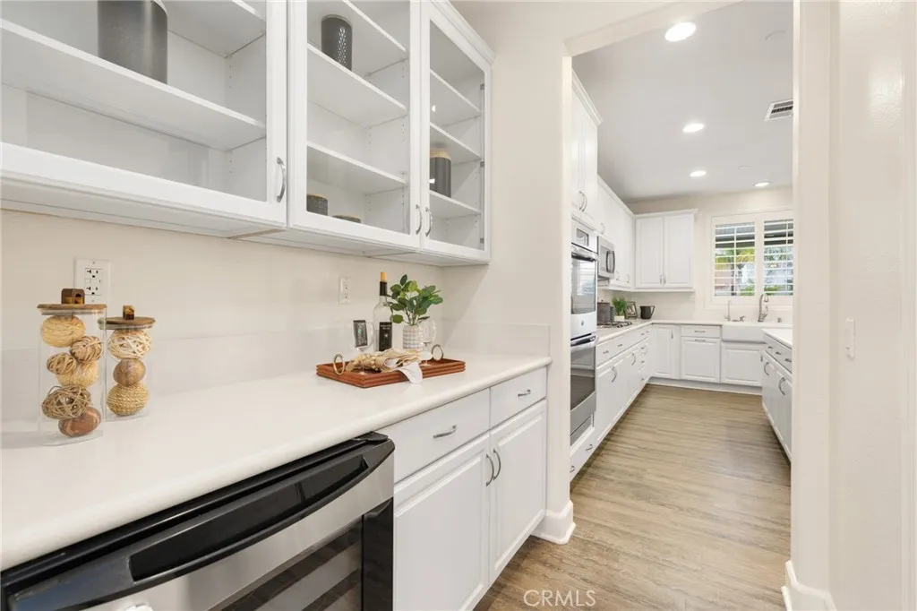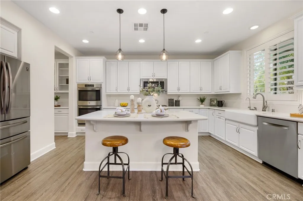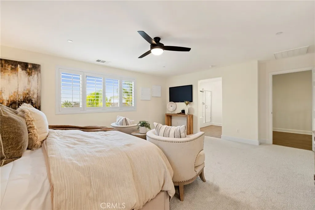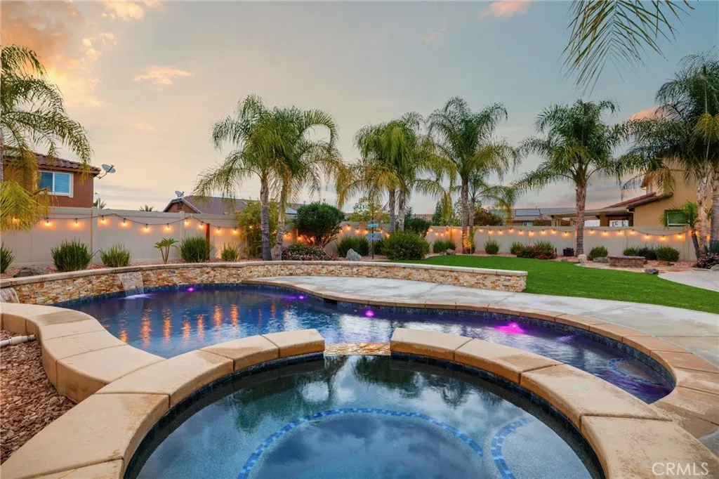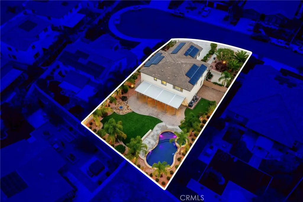 Welcome home to Roundup Circle, located in the prestigious community of Audie Murphy Ranch in Menifee. This exquisite 5-bedroom, 4 bath property offers almost 3500 sqft of living space on over a quarter acre featuring a pool and spa, water softener, whole house water filtration, and owned solar on a cul-de-sac. The spacious front yard greets you with drought tolerant landscaping, an extra wide driveway, custom steps that lead to a large courtyard and quaint porch with gorgeous mountain views. As you enter the home you are greeted by tall ceilings, new interior paint, LVP floors, plantation shutters and a highly desirable floor plan. The living room offers tons of light flooding in from the large windows and flows right into the butler’s pantry boasting a wine fridge in the built-in cabinets situated across from the large walk-in pantry. The chef’s kitchen is appointed with quartz counters, double oven, 5 burner stove, RO water system, farm sink, newer dishwasher and fridge. The eat up island faces the large eating area boasting a custom chandelier and flows right into the Great Room. The spacious Great Room features a gas fireplace and the opportunity to build custom cabinetry. The main floor offers a spacious Junior Suite boasting new carpet and attached bath featuring a single vanity and walk-in shower. The second main floor bath is a powder room perfect for guests just off the entrance to the 3-car garage offering tons of storage. The second story boasts LVP floors, a massive loft, the three large secondary bedrooms, all featuring new carpet, gorgeous views and two of the three have walk-in closets. They all share a secondary bath boasting a dual vanity and shower tub combo. The upstairs laundry room boasts custom storage and wash sink. The oversized primary bedroom offers new carpet, plantation shutters, mountain views and an attached bath boasting a dual vanity, seating area, soaking tub, shower and large walk-in closet. The 13,000 sqft entertainers dream yard is appointed with stamped concrete, large aluma wood patio cover, artificial turf, gas fire pit, a putting green and a 2021 built pebble tech pool featuring a baja step, waterfalls, and large spa, with a built-in seating area. The community features pools, spa, club house, sports courts, skate park, trails, the new Kathryn Newport Middle school and award winning Taawila ES that is just feet from the home. The community is located between the 15 and 215 freeways, and super close to shopping.