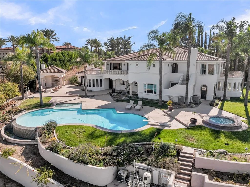 ALESSANDRO HEIGHTS- ROYAL HUNT RIDGE ESTATES- Set upon the highest elevation within the gates of Royal Hunt Ridge Estates, one of the most desirable and exclusive neighborhoods of Riverside is this remarkable hilltop estate. Recently and completely reimagined by the renowned design team of Romero and Obeji; Originally designed by Bill Davis and constructed by Neil Hansen, this incredible property offers the utmost in hospitable living. Evoking Romance Architectural styling utilizing elements of Early California Spanish Revival design with subtle contemporary flair; the Expansive Foyer, Grand Room and Formal Dining Room are ideal for entertaining on an elaborate scale; The informal living center enveloping the immense kitchen affords more intimate family gathering. The spacious home theater complete with balcony provides the perfect escape for movie night or viewing the big game! The front stair at the rear of the foyer winds to the second level landing providing access to the primary suite where exists the perfect retreat from a hectic lifestyle; Restful bedroom space and sitting room with private terrace; Spa quality primary bath with a large barrier free shower, freestanding tub and rejuvenating dry sauna; A dream closet made to make organization simple with efficient custom built-ins throughout; Two private stairs connect the primary suite to the theater and the pool/spa areas. Four additional large family bedrooms, each with a private ensuite bath and walk-in closet, a large laundry room and a craft room complete the upper level. A back stair connects the secondary bedrooms to the kitchen area. Main level guest quarters off the foyer also with ensuite bath and private entrance to the pool makes for a total of 6 bedrooms suites. There is also an exercise room with mirrored walls rubber gym flooring for sound and a full bath; The grounds live like a 5-star resort with the massive vanishing edge pool, separate spa, summer house with built-in barbecue, fireplace and cabana bath; Lower lever recreation has with lit regulation tennis court, shuffle board court and lawn volley-ball. Privately secured and gated driveway, with ample off-street parking in the motor-court; an oversized 4-car garage; Extensive Orchard of Naval Orange, Meyer Lemon, Pomelo, Avocado, Stone Fruits, Apple, Pear, Banana and Passion Fruit; Specimen quality shade trees and landscape! A must see for the sophisticated buyer seeking a residence truly exemplary of their success!