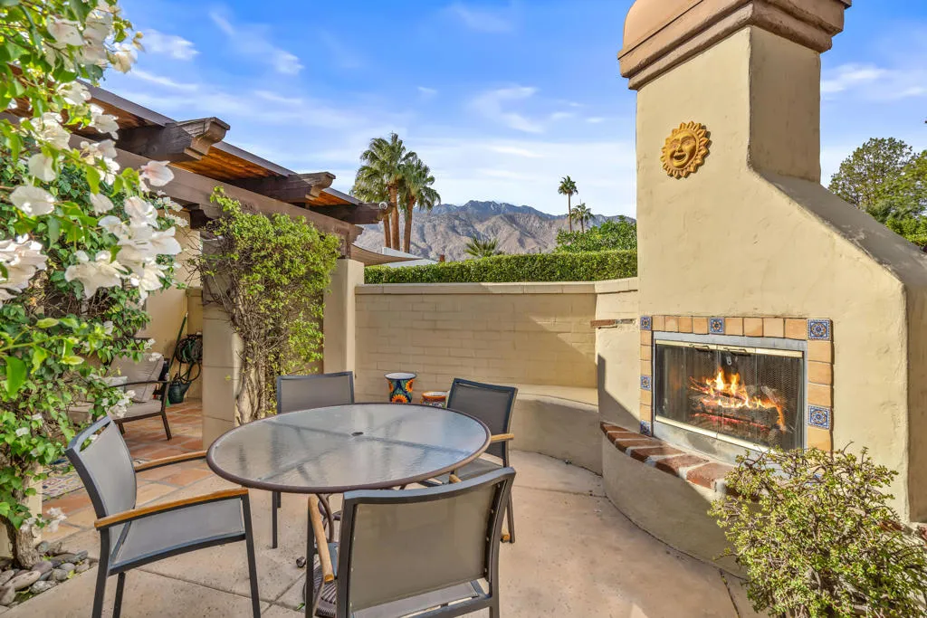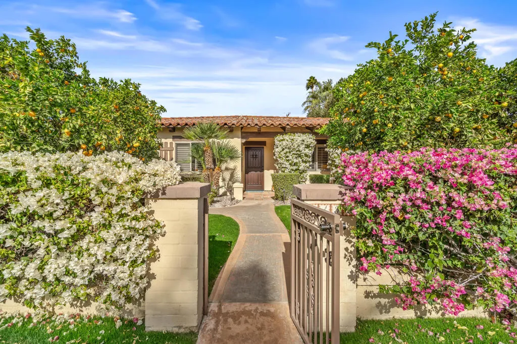 This beautifully, custom built Spanish Hacienda home awaits your personal inspection. Be prepared to fall in love with this gorgeous property within just minutes to downtown Palm Springs on a very quiet street. The Spanish decor and construction is of the highest quality and built in 1999. Enter through gates, beyond walls and lush grounds including mature flowering vines and orange trees to the charming front porch perfect for relaxing and enjoying the SW mountain views. Saltillo tiles throughout the primary rooms and plush carpet is on hand in all 3 bedrooms. There are 3 full bathrooms as well. All rooms in the 2030 square feet of living space are large in proportion and invite the very best of relaxing living while offering a great flow from indoors to out for entertaining. Enjoy 3 fireplaces! In the living room, owner’s suite and outdoor patio beyond the fully covered patio accessible from the kitchen’s French Doors and the owner’s suite. The owner’s suite offers dramatic mountain vista views beyond the patio fireplace walk-in closet and dramatic double-vanity bathroom. In addition to windows overlooking the refreshing pebble-tec pool, spa and patio areas also with fantastic west mountain views. All bedrooms offer excellent separation. From the large living room, enter the dining room and beyond the oversized island/bar kitchen with prep sink and additional banquet dining area. Enjoy the charming curb appeal, security, privacy & amenities or use for passive income. Offered Turnkey Furnished!