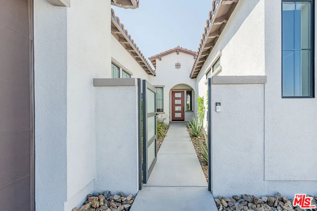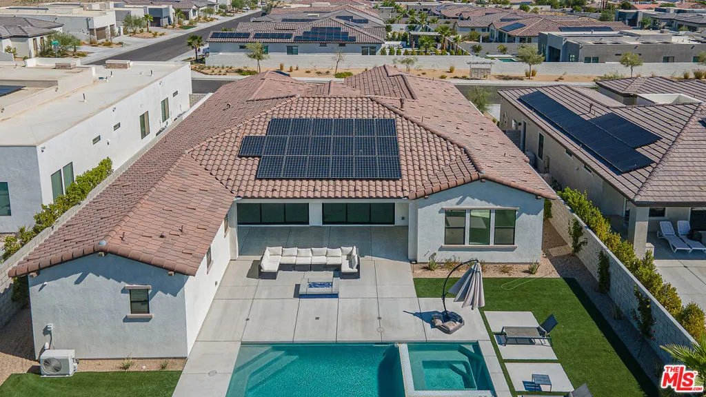 Welcome to Montage Palm Desert! This stunning Spanish Elevation LX Series home offers 5 bedrooms and 4.5 bathrooms, including a private detached casita with its own entrance, bathroom, air conditioning, and solar panelsideal as a guest suite or pool cabana. Spanning approximately 3,297 sq ft, the open-concept layout includes a spacious media/club room, dedicated office space, and soaring high ceilings that create a bright, airy ambiance. The interior is elegantly appointed with white cabinetry, quartz countertops, stylish tile surrounds, and modern flooring throughout. Enjoy the best of desert living with a pebble pool and spa, basic rear landscaping, and a 3-car garage configuration2 attached and 1 detached.