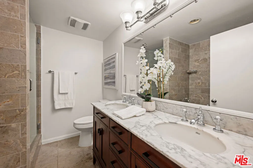 Gorgeous condo that has been used as a 3 bedroom plus 2 1/2 baths. It has a very versatile floor plan with a spacious private primary suite and 2 large walk in closets. The kitchen has beautiful granite counter tops, tons of white cabinets with ample storage, and was updated with all new appliances recently. The bathrooms have Carrara marble vanities with double sinks in the primary, marble floors and wall tiles, all are renovated. The living room has a beautiful marble fireplace, wainscoting , crown molding and grand detailing. A charming office alcove that provides a show case for books and objects of art. A mirrored bar for entertaining and additional sitting at the counter top with serving from the kitchen. The dining area has pretty greenery views and has room to seat a large party. The enclosed den can be a third bedroom with a half bath. The secondary bedroom is generous in size and has closets galore. The primary suite is quite large and has it’s own vanity area, big walk in closet and en suite bath with double sinks. There are hardwood floors through out all bedrooms and entertaining rooms. The side by side washer and dryer are inside the unit. A top of the line HVAC system was installed recently with a Nest thermostat control. There are two parking spaces, a recreation room, gym, sauna, storage unit and pool as well. The location is superb and is just minutes to world class shopping, dining , and the soon to be completed Metro.