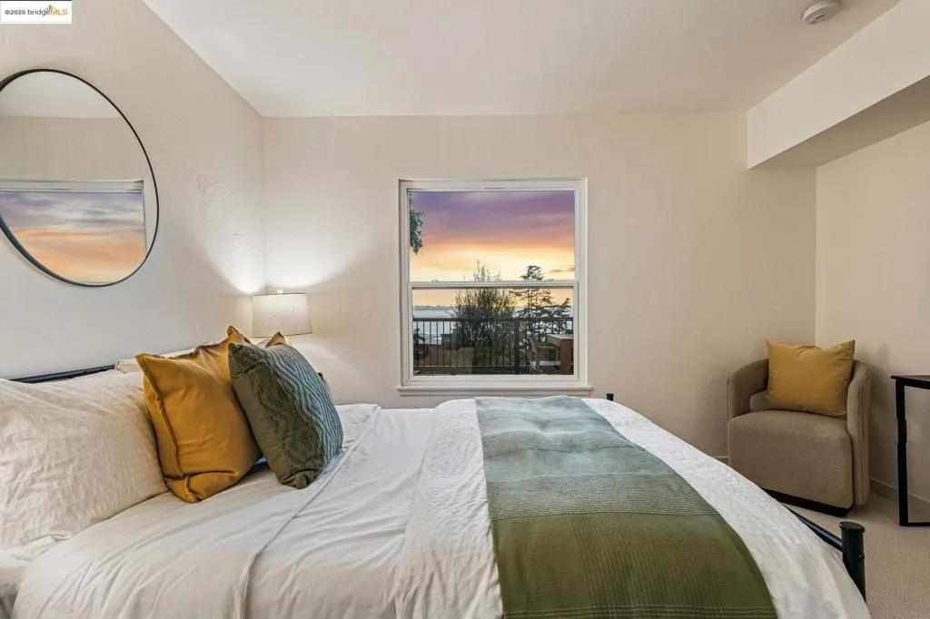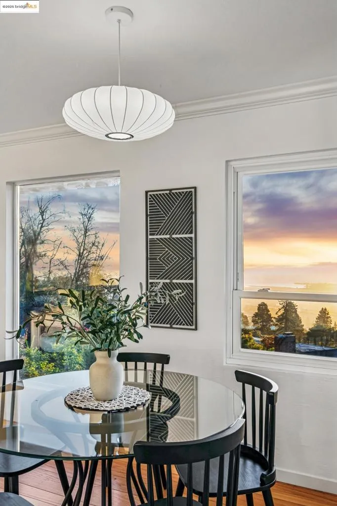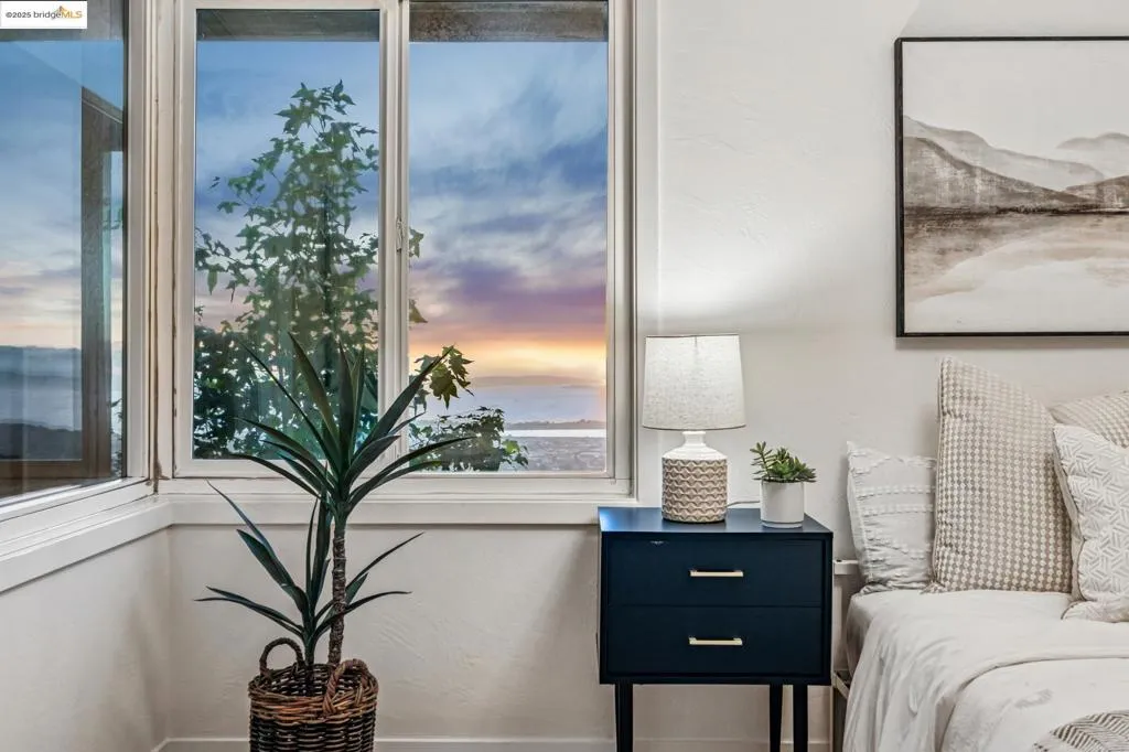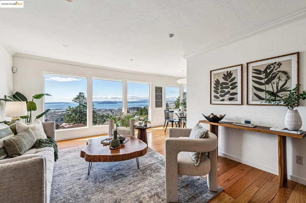 Welcome to this exceptional Berkeley Hills residence offering 2,100 sq ft of thoughtfully designed living space and stunning panoramic Bay views. From nearly every room—and the spacious decks—you can see all three iconic bridges. Whether enjoying morning coffee or hosting evening gatherings, sunsets and sparkling city lights create a remarkable backdrop. A gated entrance provides privacy, and a 2-car garage with an EV charger adds convenience. Inside, refinished hardwood floors, new carpet, dual-pane windows, and a newer roof offer comfort and peace of mind. Fireplaces on both levels add warmth and charm. The lower level provides flexible space—ideal for an in-law suite, guest quarters, office, or separate living area—with excellent storage and its own sense of independence. With nearby trails just moments away, you’ll enjoy easy access to nature and outdoor recreation. This home blends stunning views, modern comforts, and an ideal Berkeley Hills location—an exceptional opportunity to experience Bay Area living at its finest.