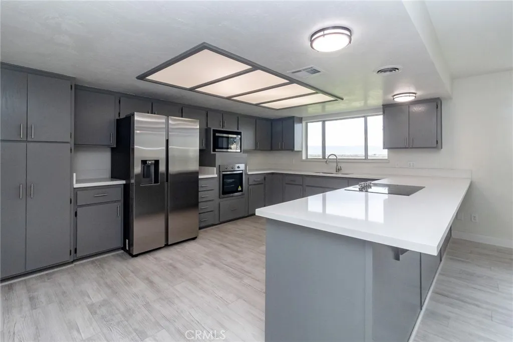 Inside, you’ll love the spacious open-concept kitchen featuring solid surface countertops, stainless steel appliances, and plenty of room for gathering. The cozy living area is centered around a warm fireplace, perfect for relaxing evenings. All spaces have been tastefully remodeled, making this home truly move-in ready.