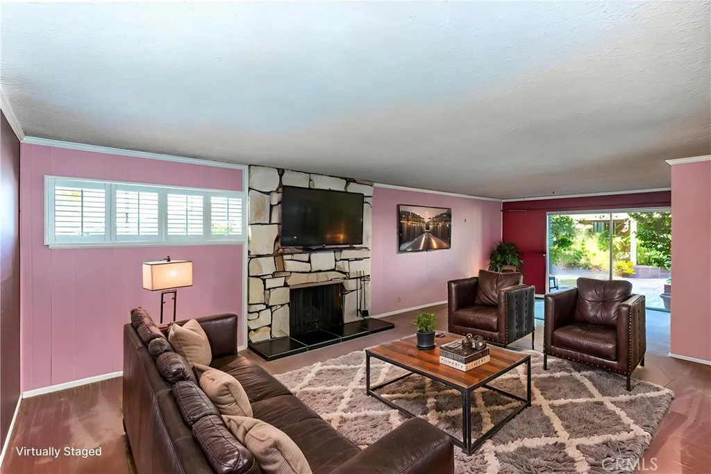Welcome to this charming corner-lot home, where impressive curb appeal greets you with mature, manicured landscaping, classic brick accents, and a peaceful front sitting area—perfect for enjoying your morning coffee or winding down at the end of the day. Step inside to discover the handcrafted touches of the original owner, showcased throughout with thoughtful detail and true pride of workmanship. The kitchen features tiled counters, a breakfast bar, and a corner sink with a lovely view of the front yard. It opens effortlessly to the dining area and a Midcentury style atrium room designed for true California indoor/outdoor living. Wall-to-wall windows fill this space with natural light, creating an airy, inviting atmosphere, while custom wood sliding doors provide the option to enclose the atrium room for added versatility-this space could also be used for additional dining for large gatherings. Wood-beamed ceilings enhance the warmth and character of the dining and atrium rooms.The spacious living room continues the theme of comfort and charm, offering a stunning rock fireplace and a large sliding glass door that brings in additional natural light and frames views of the tranquil backyard. Outside, the backyard feels like a private retreat, complete with a relaxing brick patio, lush landscaping, and a handcrafted storage cabinet. With access from both the atrium room and the living room, this outdoor space is ideal for entertaining, weekend BBQs, or simply enjoying quiet moments at home. Three well-appointed bedrooms with plantation shutters provide comfort and privacy, including a primary suite with its own private bathroom. One of the secondary bedrooms features a built-in desk—perfect for a home office or study area. Additional conveniences include central air, a sprinkler system, garage storage, and direct garage access. Ideally located just moments from Regional Park, La Mirada Golf Course, Biola University, La Mirada Theater, popular dining, and convenient shopping, this home blends character, comfort, and an unbeatable location into one exceptional opportunity.—-SOME PICS ARE VIRTUALLY STAGED/ENHANCED–