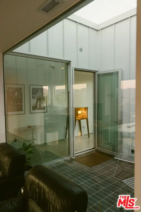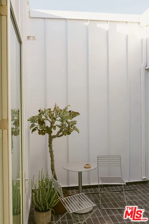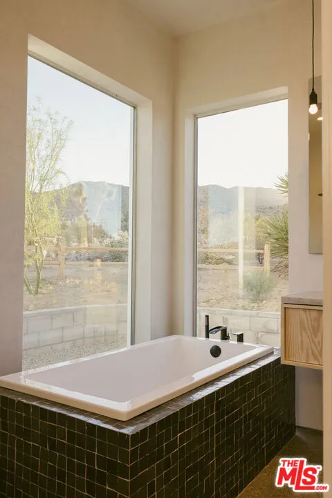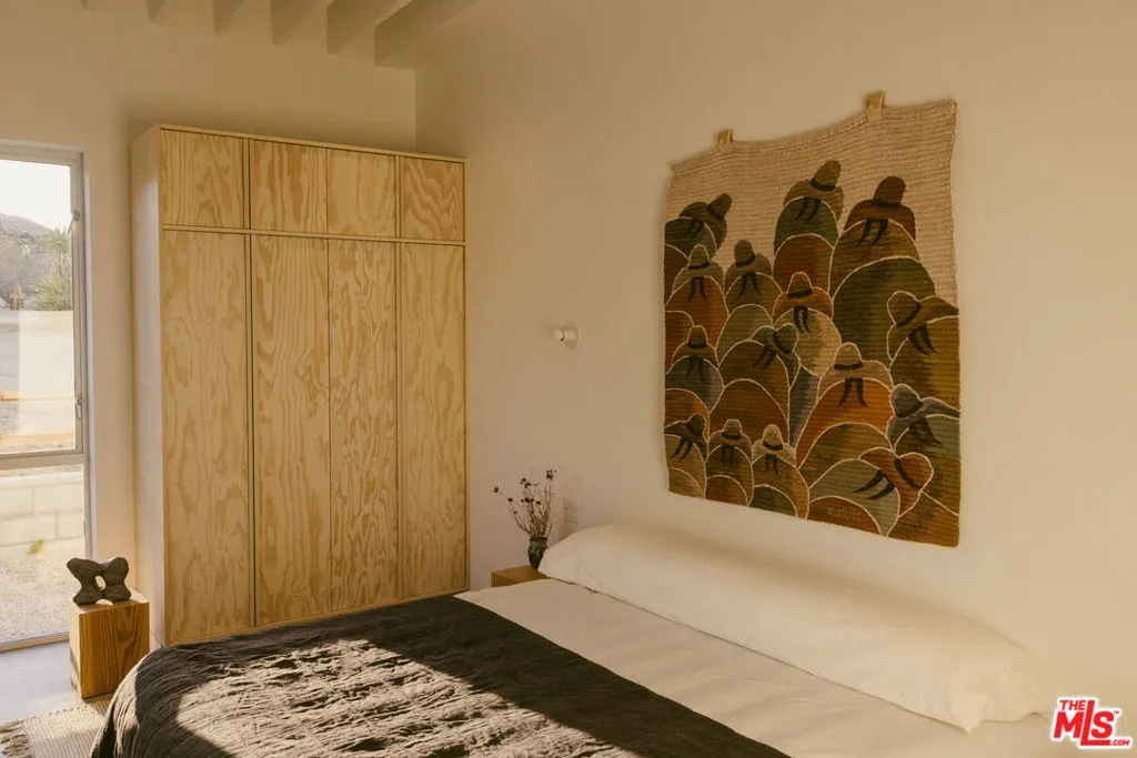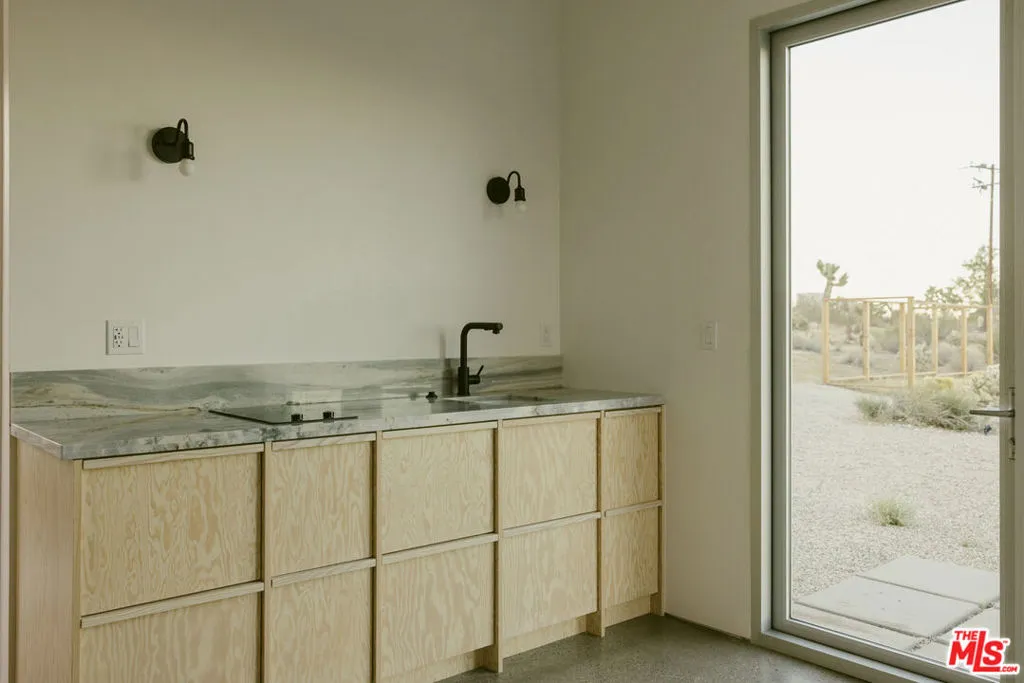 Designed to live in rhythm with the desert sun, this newly built modern residence offers a rare balance of architectural intention, nature-integrated living, and refined comfort. Set against a mountain side and wide-open landscape of Joshua Tree, the home presents a serene sanctuary where clean lines, warm minimalism, and immersive natural light shape the experience from the moment you arrive. Anchored by a restrained contemporary silhouette, the 2,323 sq ft house + casita is defined by its off-white steel facade and expansive large metal frame glass that dissolves the threshold between indoors and out. Stepping inside, the atmosphere shifts into a quiet, grounded elegance bright, airy, and softly diffused light throughout the day. An internal atrium, wrapped in glass, forms the heart of the home, drawing in natural light while establishing a constant connection to land and sky. The interiors reflect a thoughtful commitment to natural materials, craftsmanship, and warm Scandinavian undertones. Concrete floors flow throughout, complemented by custom Douglas Fir cabinetry that brings a tactile, organic calm to every room. The kitchen pairs quartzite countertops with integrated appliances for a refined, minimalist profile, while a sculptural floating concrete bench anchors the living space with gallery-like simplicity. A dedicated office wrapped in wood walls and ceilings offers a quiet, soulful workspace for creative living or remote work, with a custom built-in table top. Two spa-inspired bathrooms in the main house are finished in hand-applied tadelakt plaster, one featuring a built-in tub wrapped in glossy Zellige tile for a luxurious, retreat-like ritual. A detached casita – a fully self-contained 1 bedroom, 1 bath suite with kitchenette – sits near the pool with its own private outdoor area, offering guests or residents an independent haven with a resort-like sensibility. Outdoors, the property unfolds across 1.05 acres of native, drought-tolerant desert landscaping, curated pathways, and sculptural plantings that echo the surrounding terrain. Lounge areas, a fire pit, and a pool and spa invite slow mornings, golden-hour reflection, and stargazing beneath expansive desert skies. With sunrise and sunset views, open land, and wildlife quail, roadrunners, and coyotes this home embodies the restorative, creative, and nature-oriented spirit of Joshua Tree. A modern desert retreat designed for deeper connection where architecture, land, and light live in effortless balance.